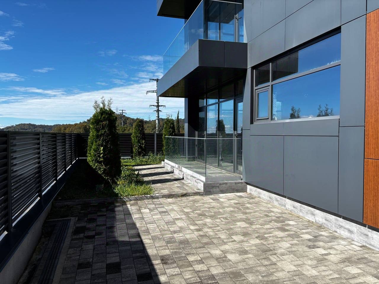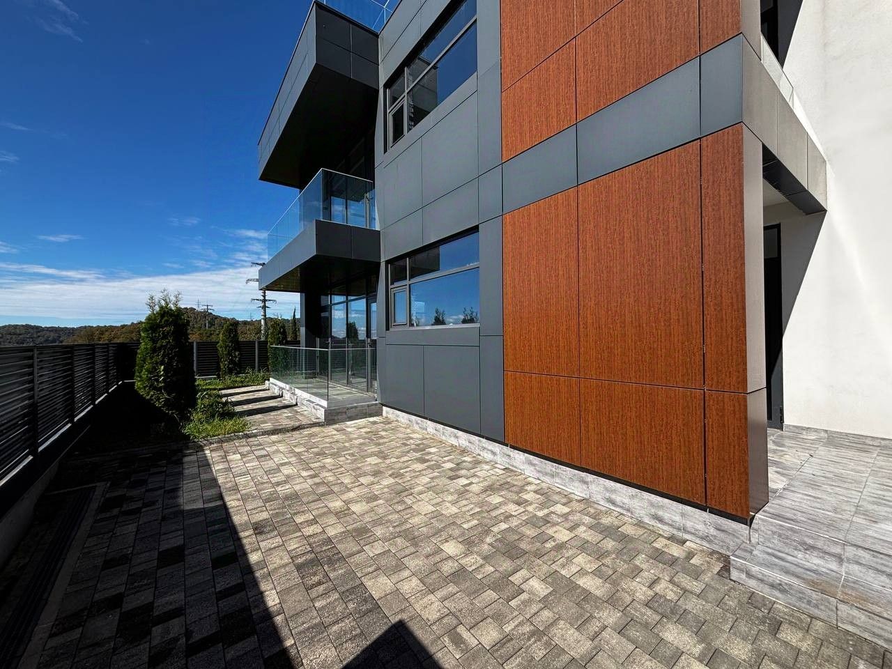 Современные материалы отделки фасада (монолитная конструкция, блочное заполнение), Элитная отделка керамогранитом, качественные панельные окна из прочного алюминия с прекрасным панорамным обзором, Приватная территория, собственный бассейн, элегантная терраса и ухоженное зелёное пространство вокруг дома.