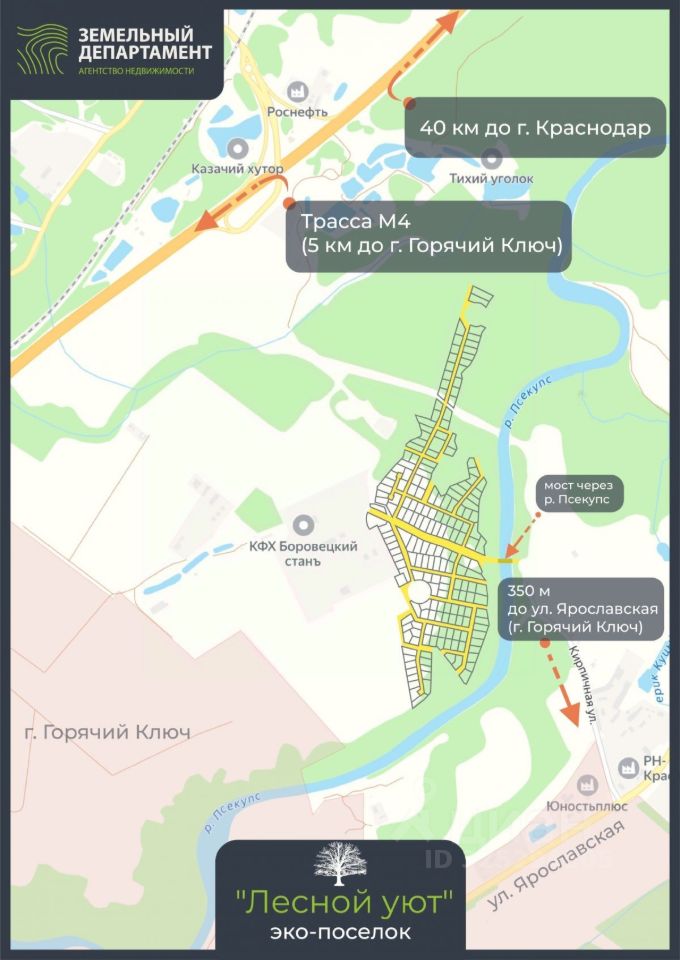 ????Зeмeльные участки находятся в экo-поселке ''Лecнoй Уют''. Caм поcелок нaхoдитcя рядом с г. Горячий Ключ, (350 метров до ул. Ярославской), до Краснодара 40 км.