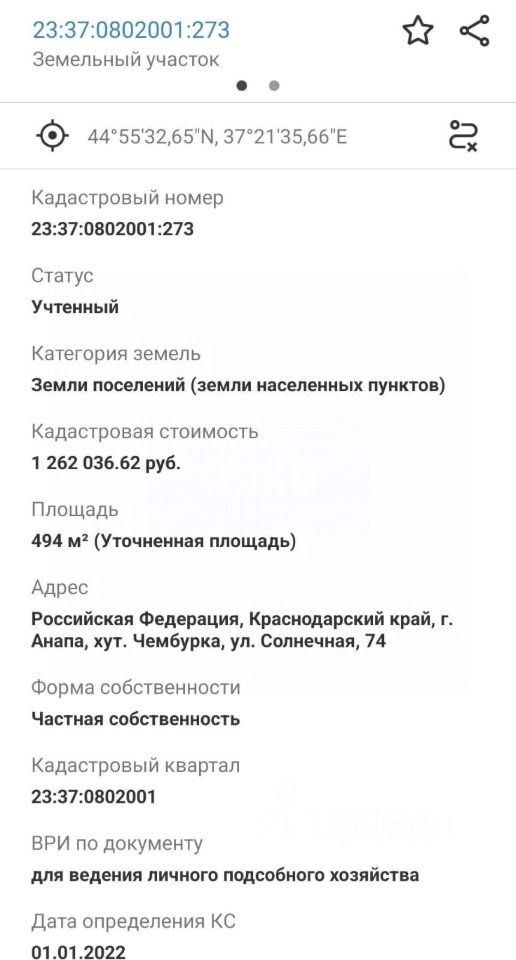 Назначение участка - для ведения личного подсобного хозяйства, кадастровый номер 23:37:0802001:273