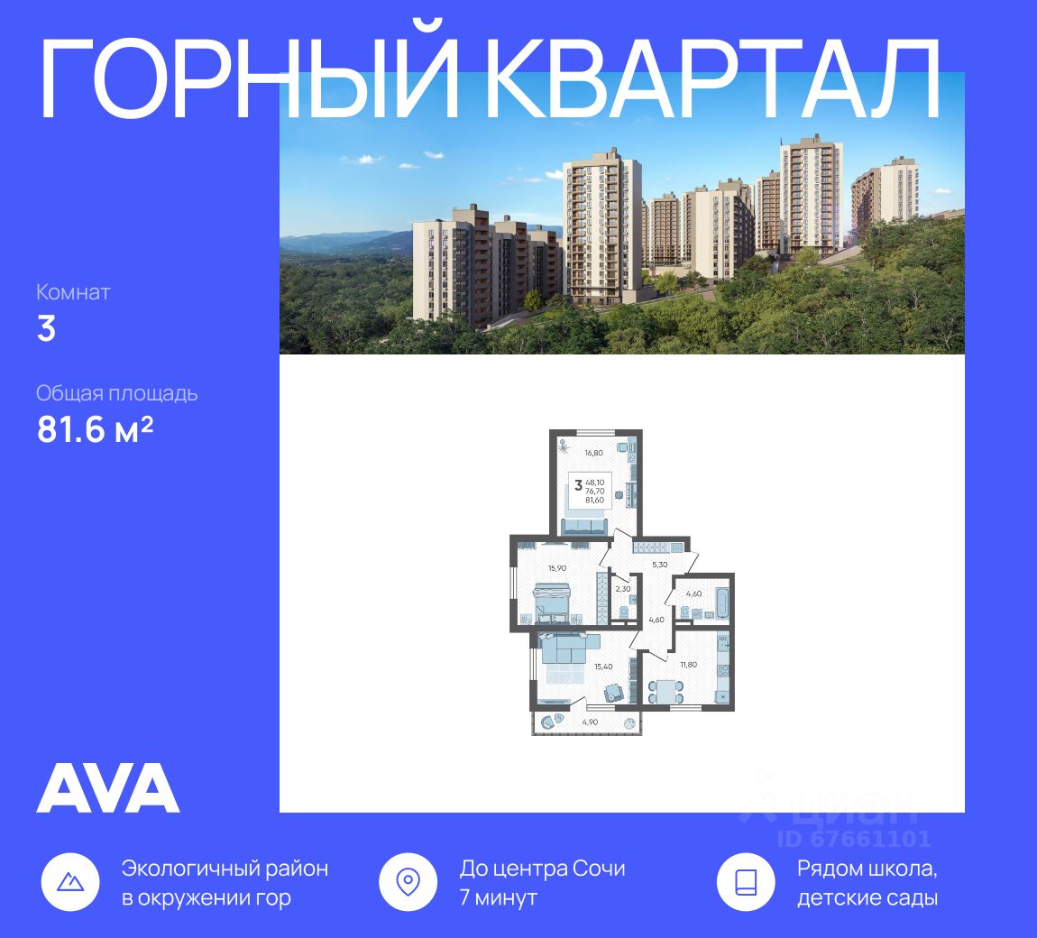 Продается 3-комнатная квартира в доме (Литер 1), срок сдачи : 3 кв. 2026, общей площадью 81.6 кв.м., на 3 этаже в новом современном жилом комплексе в Сочи ''Горный квартал'', Хостинский район. Отличный вариант для инвестиций и жизни.