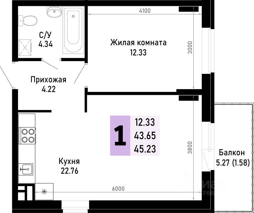 Продаётся 1-комнатная квартира в строящемся доме (Литер 4), срок сдачи: IV-кв. 2026, общей площадью 45.23 кв.м., на 1 этаже. Новый жилой комплекс по ул. Николая Лебедева от застройщика ''ССК''