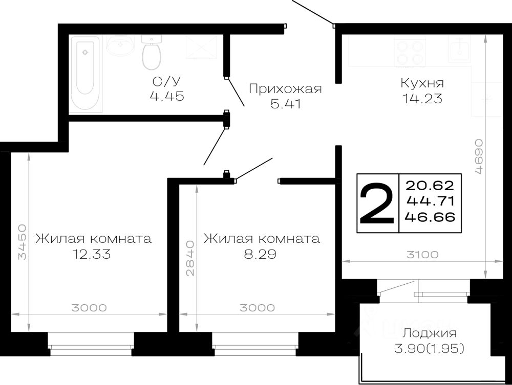 Общая площадь46,66 м2