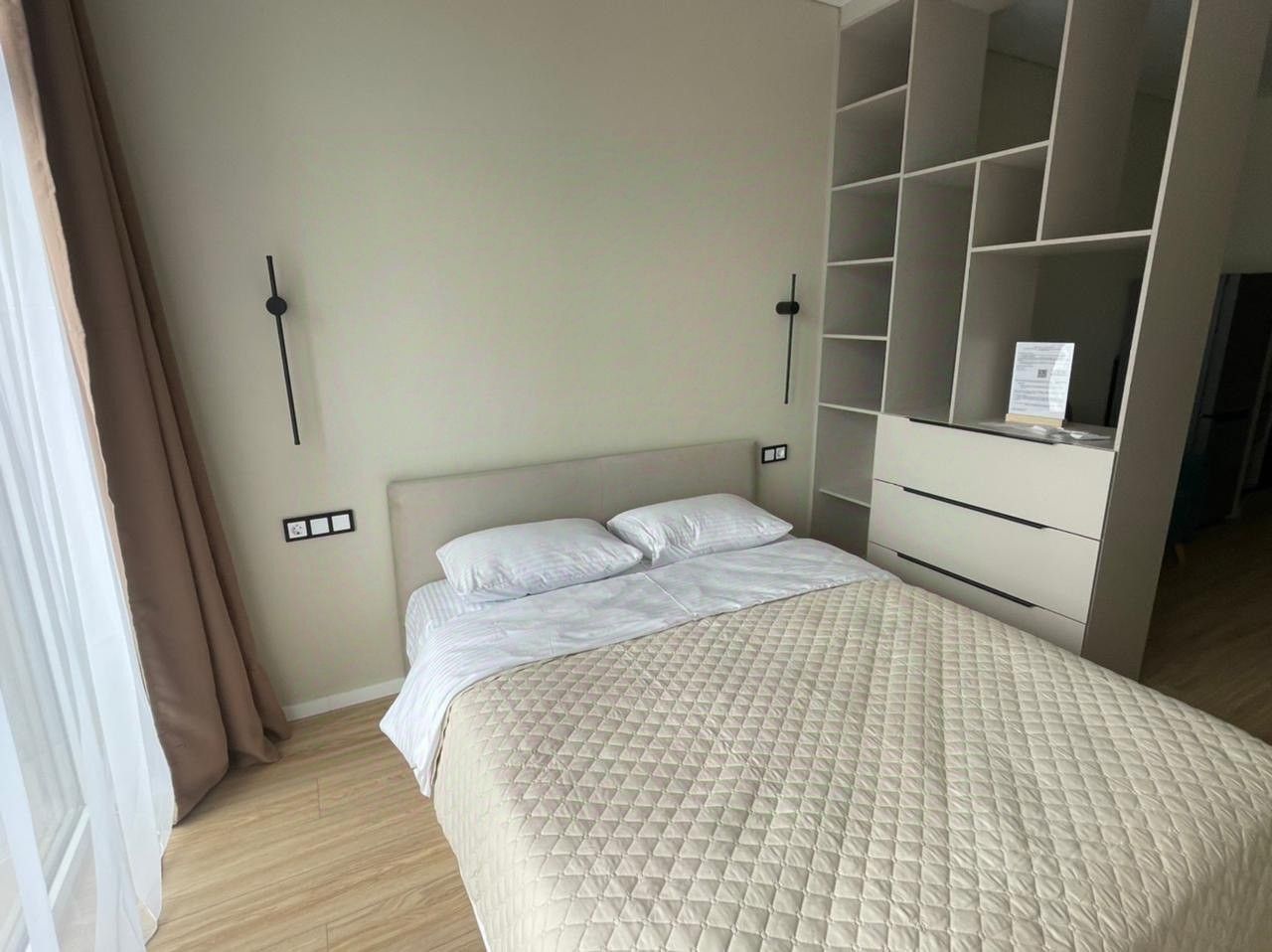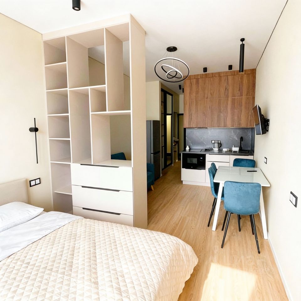 Квартира студия с витражным остеклением в пол. Выполнен новый качественный ремонт, оборудовано все мебелью и техникой, необходимой для комфорта бытья.