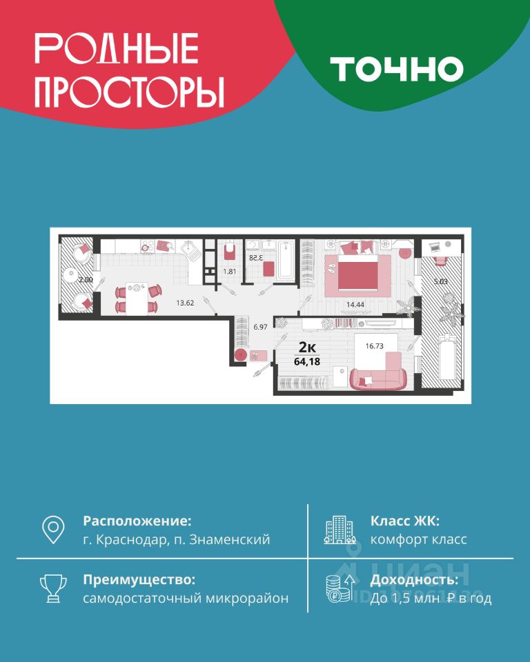 ''Родные просторы''- самодостаточный микрорайон, который реализован по принципу комплексного развития территории, где есть вся инфраструктура для комфортной жизни. На территории 41 га 29 домов от 9 до 24 этажей, уютные дворы со спортивными и игровыми площадками, социальные и коммерческие объекты, зеленые массивы и фонтаны. Главная точка притяжения ''Родных просторов'' - парк семейного отдыха площадью 9 га, 4,5 км прогулочных аллей, амфитеатр для мероприятий, кинофестивальная площадка. Особая гордость микрорайона современная школа на 1550 мест и 3 детских сада ''Ладушки'', ''Веснушки'' и ''Топотушки'' на 880 малышей. В центре микрорайона строятся фитнес-клуб BALANCE с акватермальным комплексом и собственная поликлиника, площадью более 5000 кв.м.