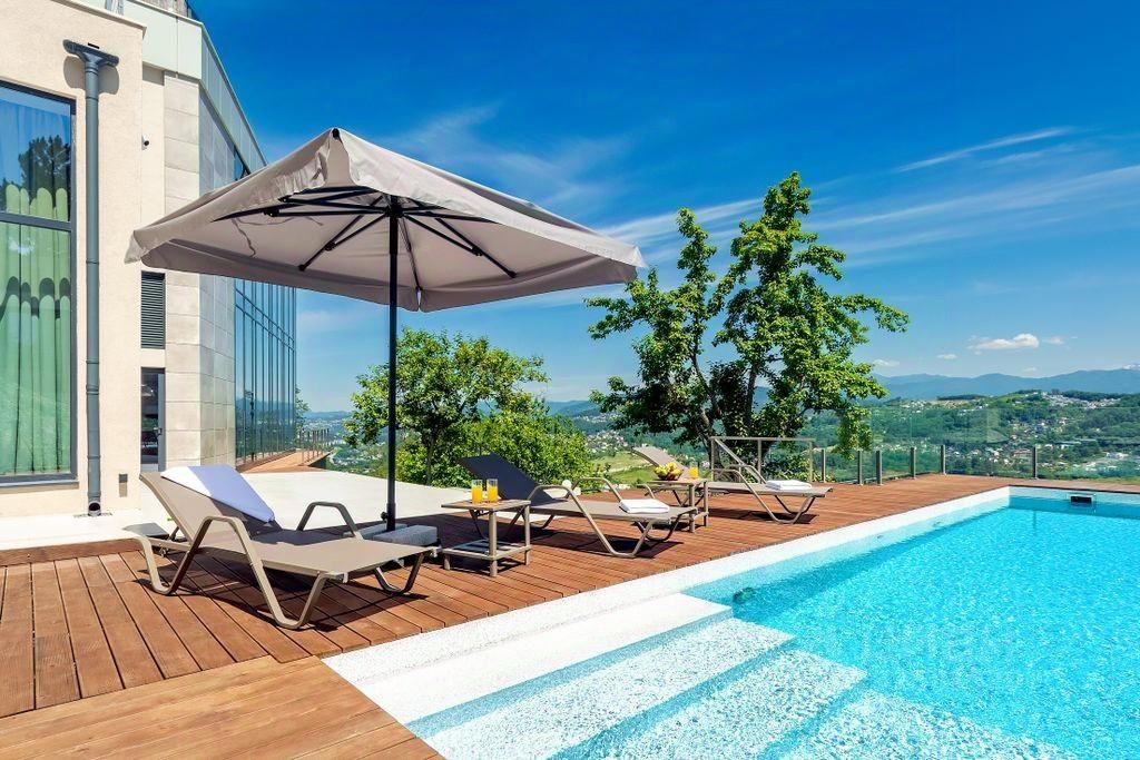 Преимущества дома: 5 изолированных спальни с двуспальными кроватями и собственными санузлами Полностью оборудованная кухня: духовой шкаф, электроплита, посудомоечная машина, полный комплект посуды Просторная гостиная с большим модульным диваном и телевизором Зона столовой с большим обеденным столом на 6 персон Панорамные окна с видом на горы Собственный бассейн с подогревом и шезлонгами Баня, зона барбекю, садовая мебель Эксплуатируемая крыша с зонами отдыха Просторные террасы с лежаками и зонами комфорта Современные санузлы: душ, биде, унитаз, раковина