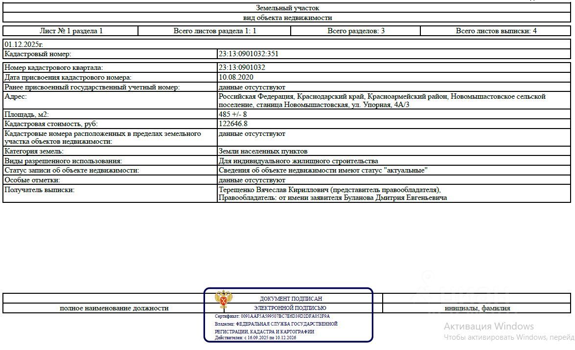 Продается участок от собственника по адресу станица Новомышастовская, ул. Упорная 4А/3, площадью 4,85 сот.