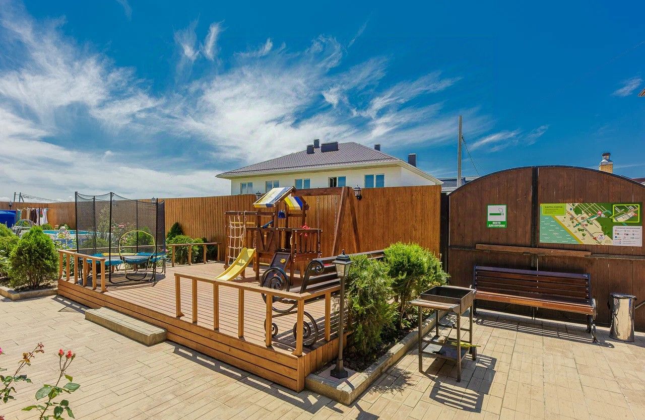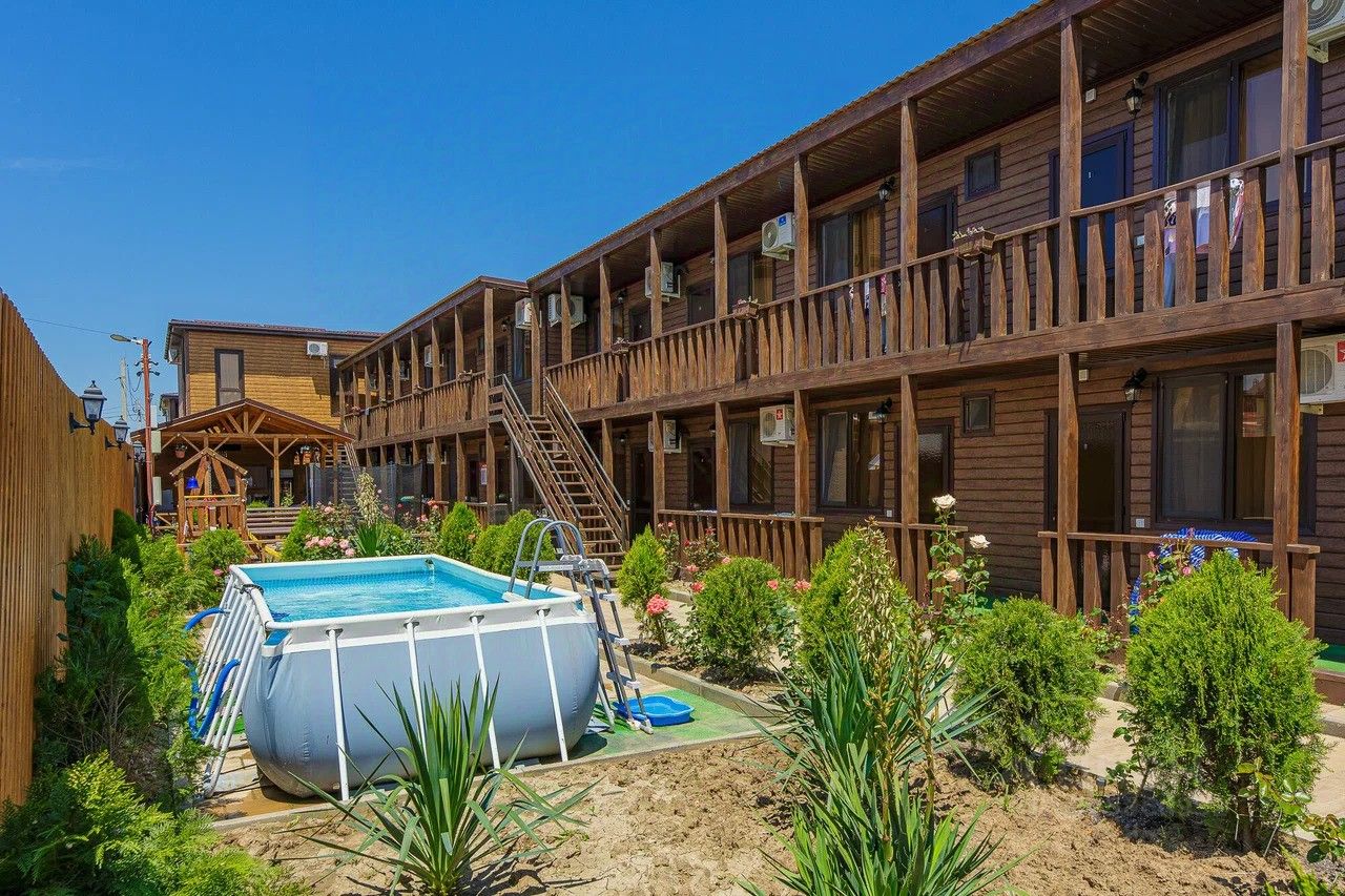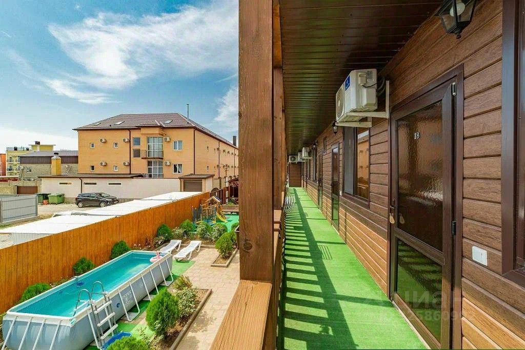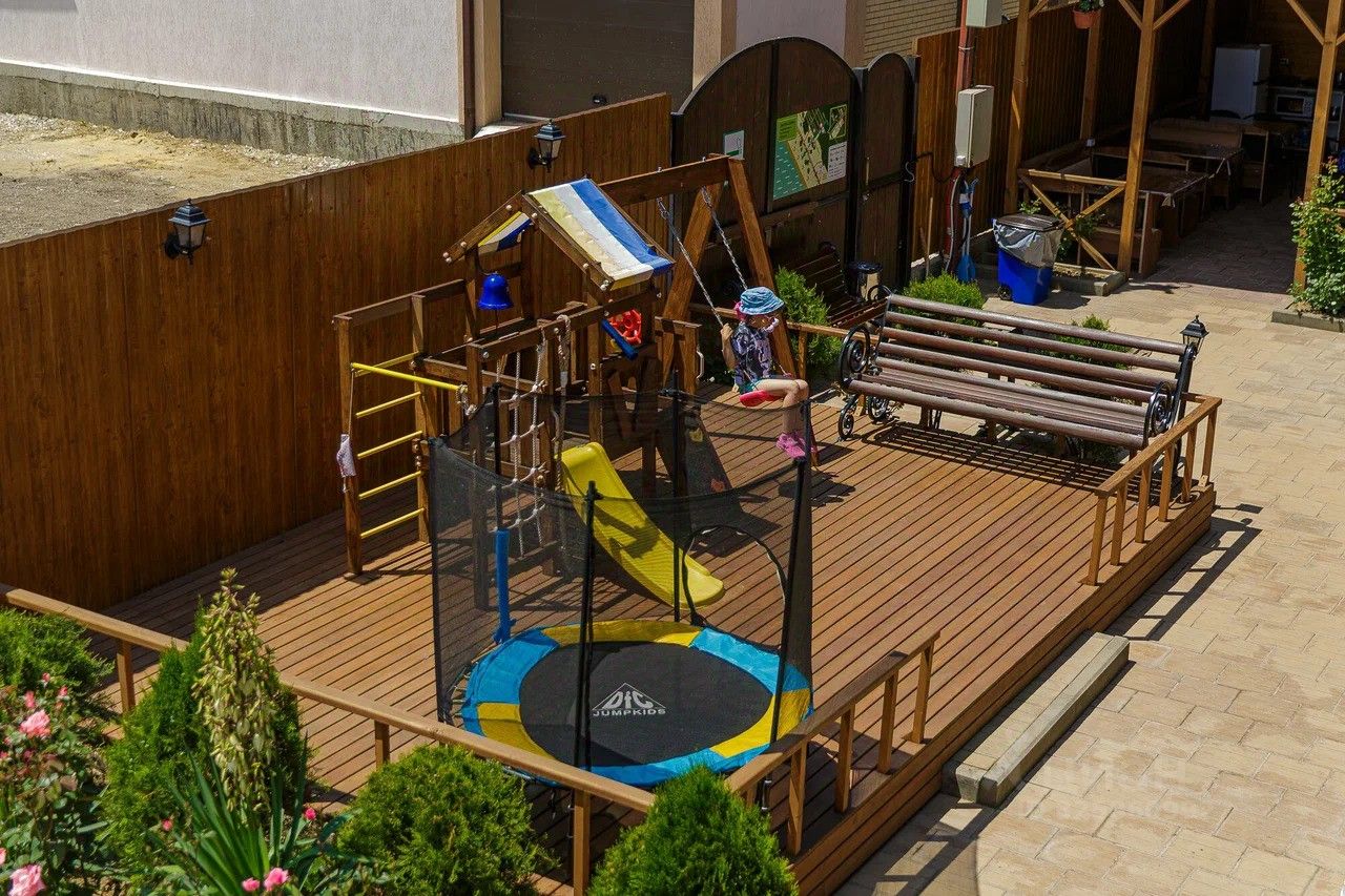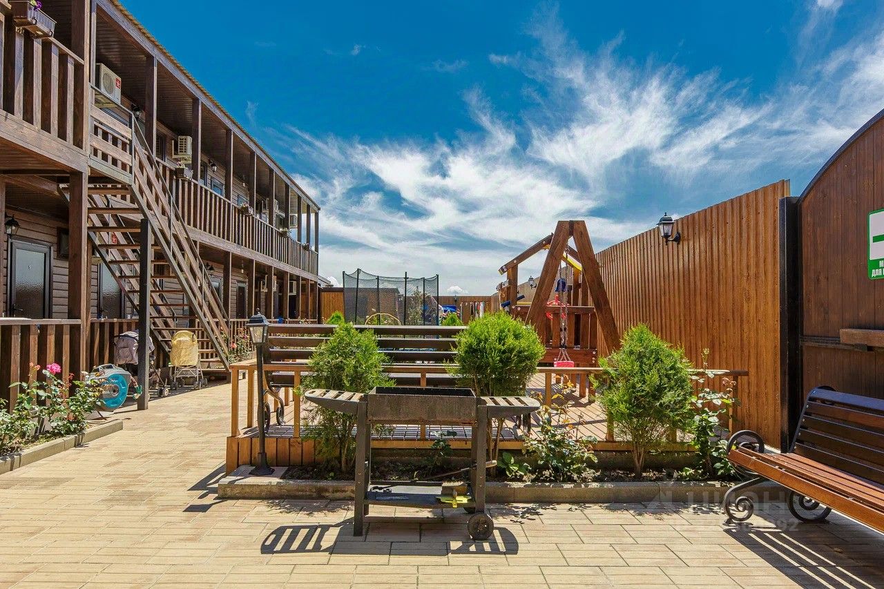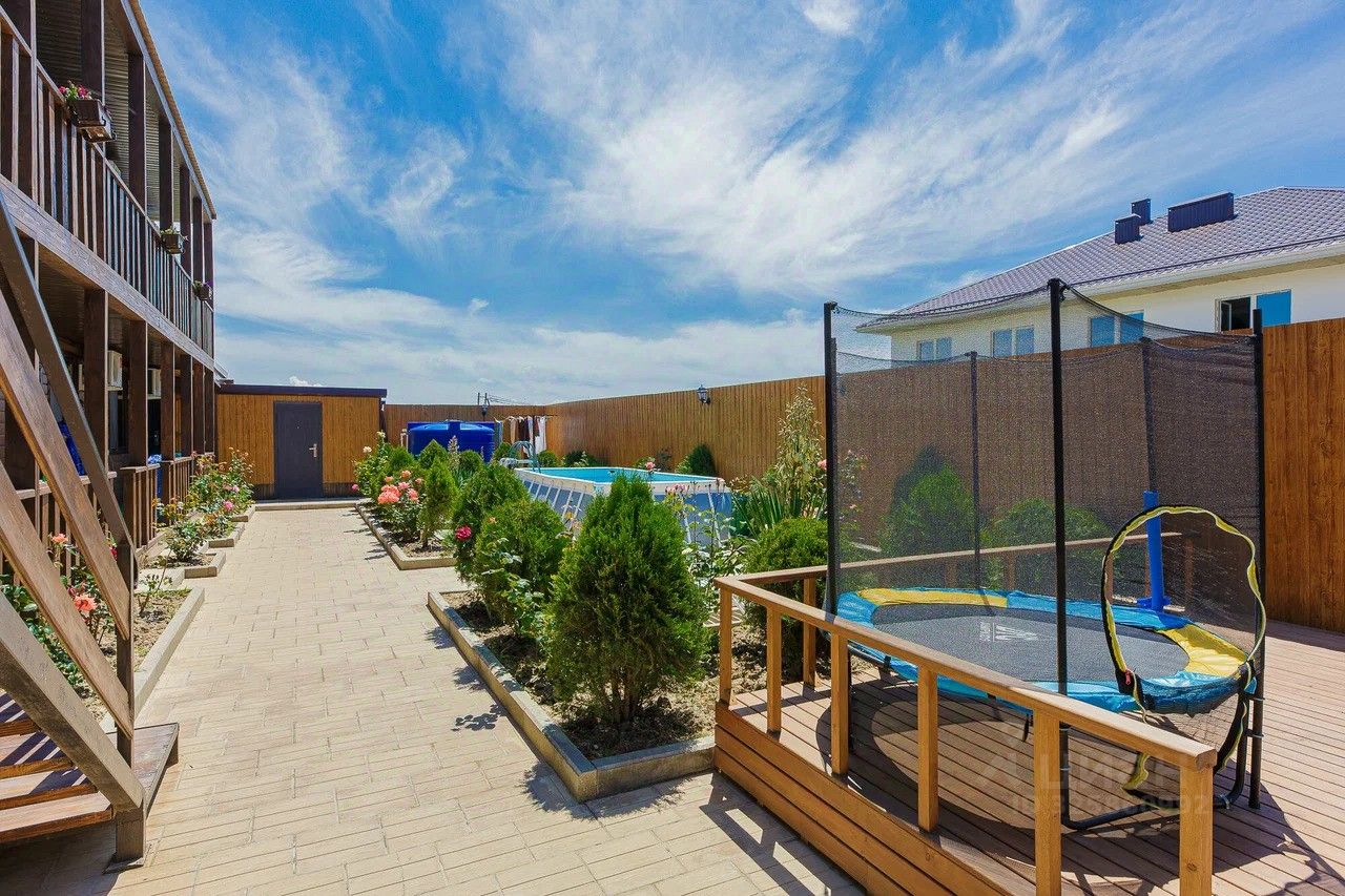 Дом состоит из 2-х этажей, общее количество студий - 18. Участок 5 соток земли , на территории большая летняя кухня, бассейн, детская площадка, лежаки и зона отдыха.