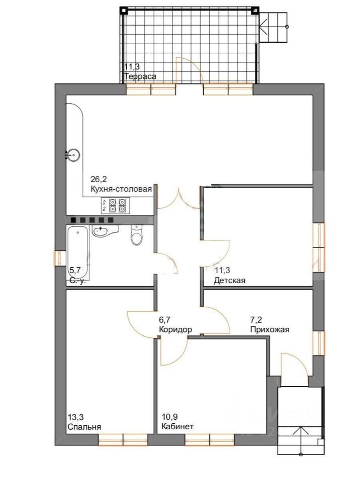 Дом в предчистовой отделке с удобной планировкой. Просторная кухня-гостинная 26,2 м2 с выходом на террасу 11,3 м2, три изолированных комнаты 14,8 м2, 10,4 м2, 9,7 м2, санузел 5,4м2, прихожая 3,9м2.