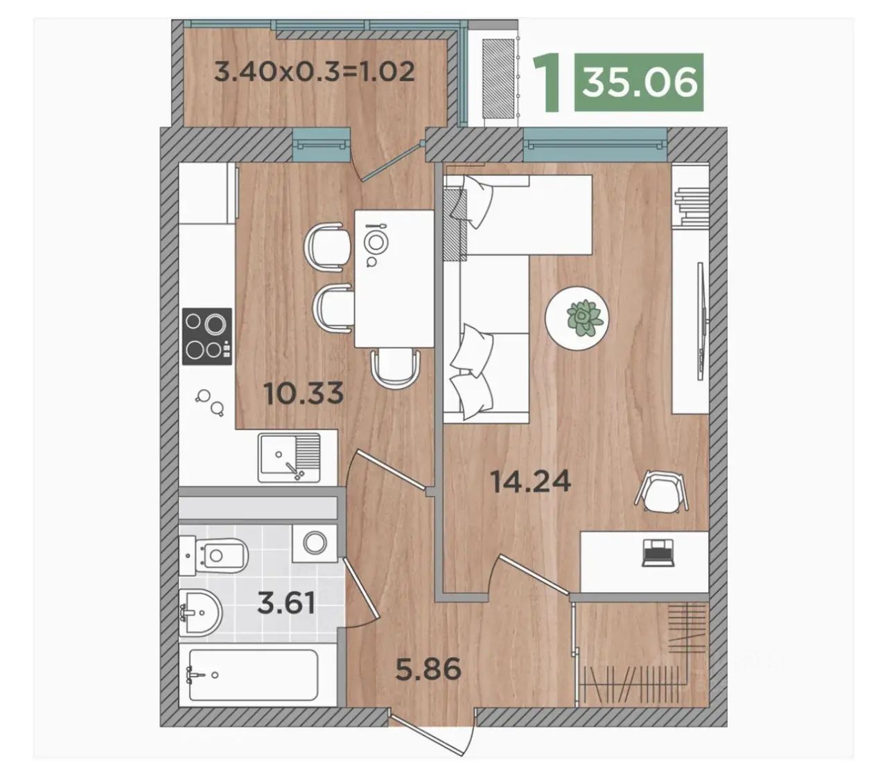 Продается уютная однокомнатная квартира в новом доме, построенном в 2023 году. Общая площадь квартиры составляет 35 кв. м, из которых 14.24 кв. м приходится на жилую зону и 10.33 кв. м на кухню. Квартира расположена на 6-ом этаже 8-этажного здания, что обеспечивает отличный вид во двор и максимальное освещение. Высота потолков — 2.8 метра.
