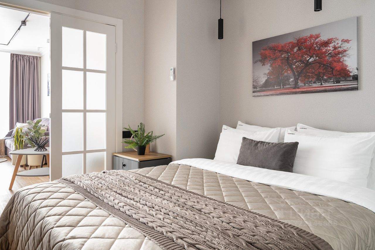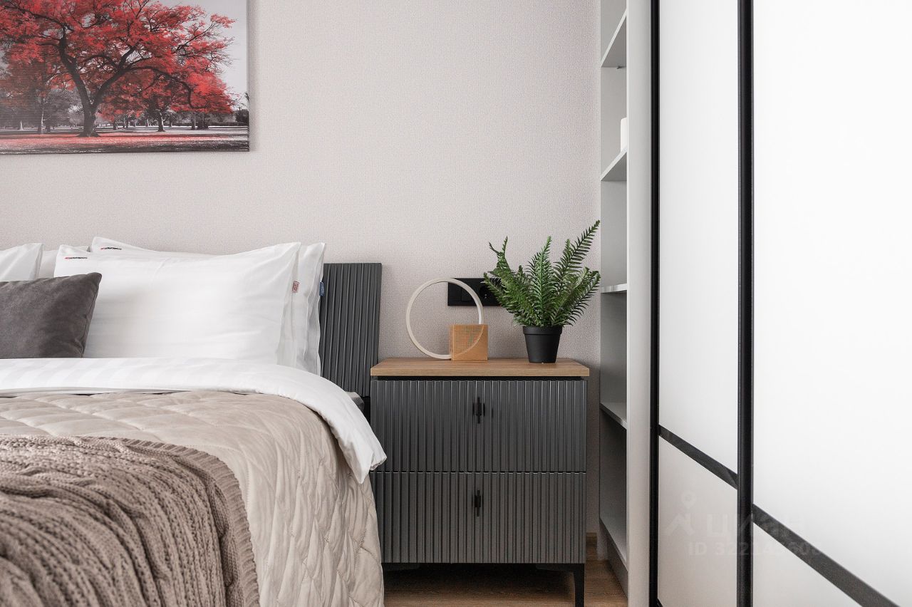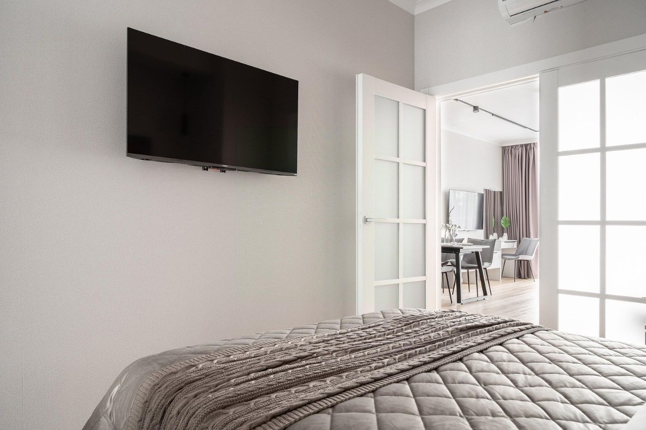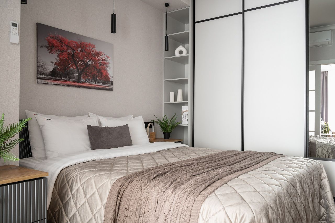 Спальня: — Широкая двуспальная кровать. — Полный комплект постельного белья. — Телевизор с плоским экраном. — Прикроватные тумбочки. — Шкаф-купе. — Тёплый пол.