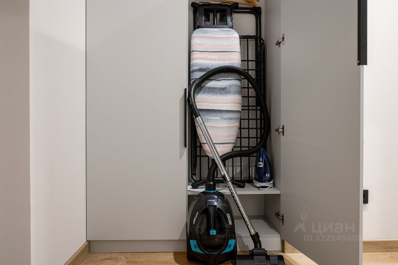 Прихожая: — Раскладной диван-кровать. — Полный комплект постельного белья. — Рабочий стол и стул. — Шкаф. — Сушилка для белья. — Утюг, гладильная доска. — Инвентарь для уборки.