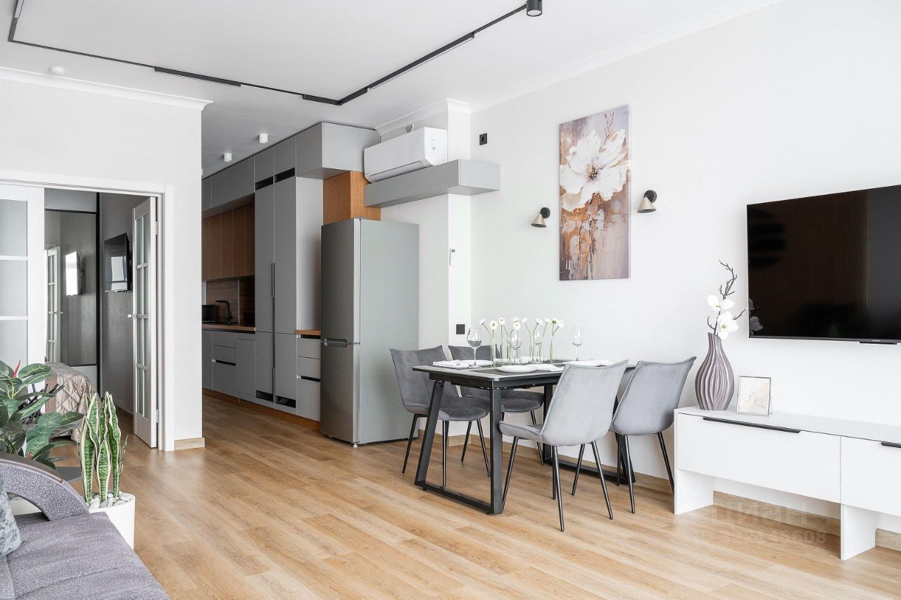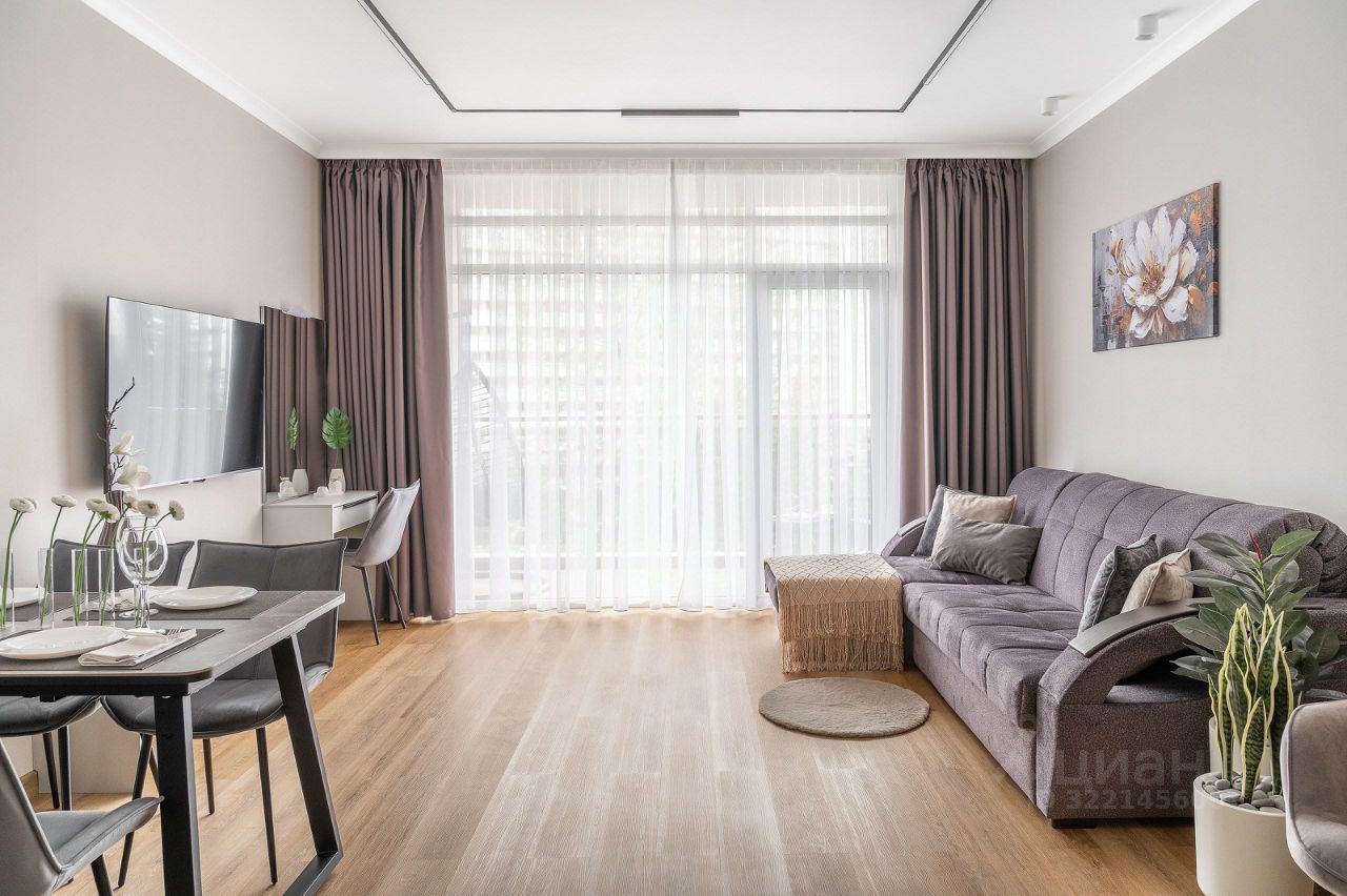 Гостиная: — Раскладной двуспальный диван. — Полный комплект постельного белья. — Кресла и журнальный столик. — Телевизор с плоским экраном. — Туалетный столик и стул. — Медиа-консоль. — Обеденный стол и стулья. — Кондиционер, тёплый пол.