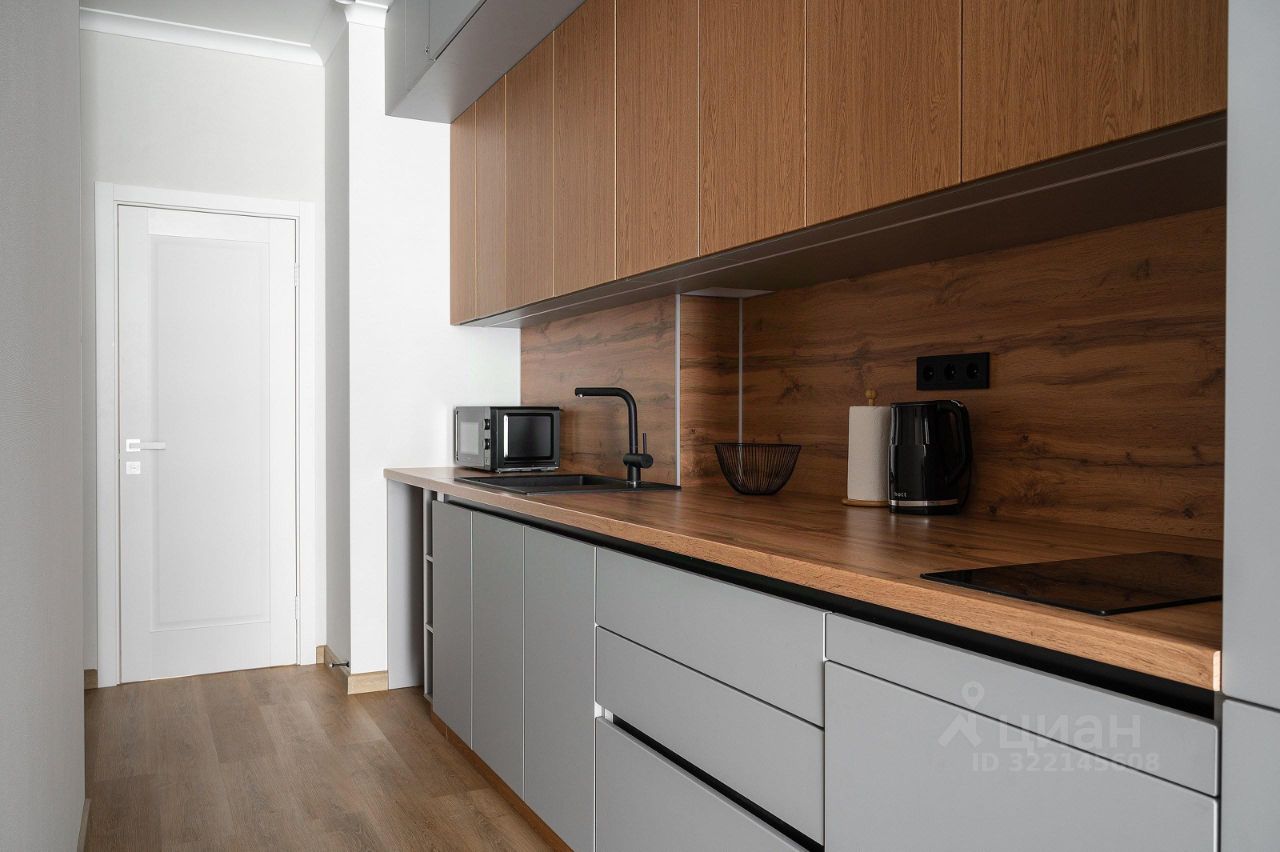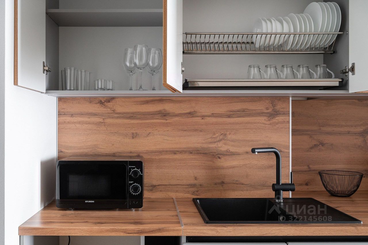 Кухня: — Вся необходимая посуда. — Холодильник, микроволновая печь, варочная панель, чайник. — Тёплый пол.