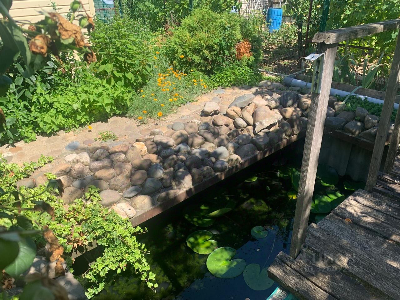 Участок 6 соток, ровный прямоугольной формы. На участке два небольших водоема с мостиком и кувшинками! Множество растений, цветов, кустарников, фруктовых деревьев.