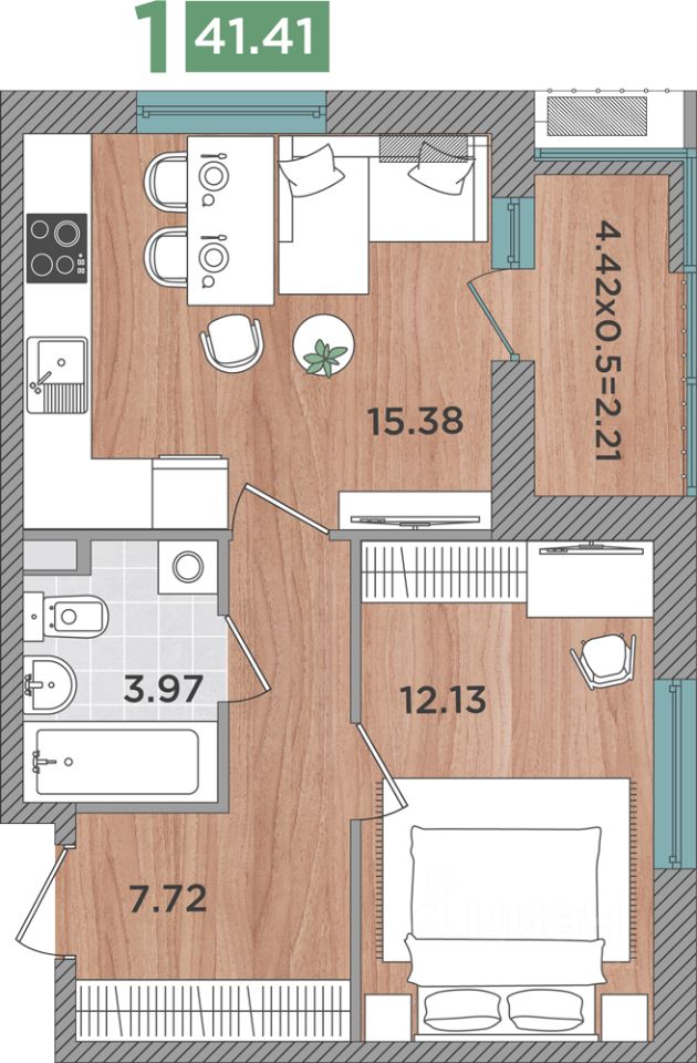 Общая площадь41,41 м2