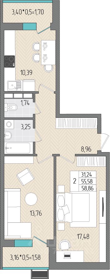 Общая площадь58,86 м2