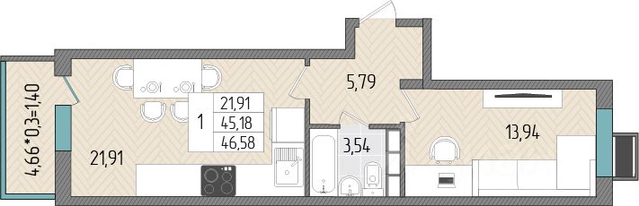 Общая площадь46,58 м2