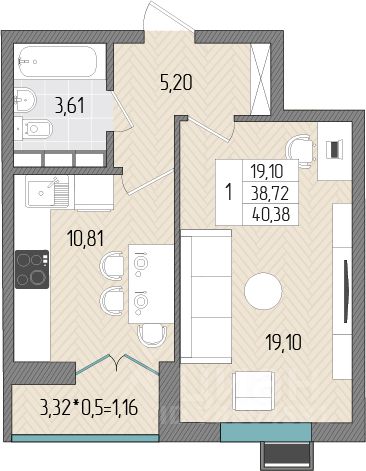 Общая площадь40,38 м2