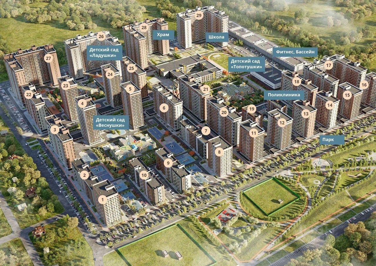 Крутая комплексная застройка территории с развитой инфраструктурой - на территории комплекса расположены школа на 1550 мест, 3 детских сада на 800 мест, поликлиника и частные клиники. На первых этажах домов расположены коммерческие помещения.