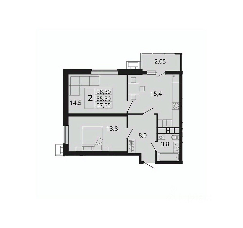 Общая площадь57,55 м2
