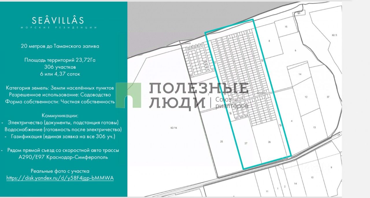 Продаётся земельный участок в 20 метрах от Черного моря в п.Тамань Краснодарского края под строительство частного дома в едином архитектурном стиле! Поселок находится на первой линии Таманского залива (в 5 минутах справа от Шато Тамань), рядом частный пляж с мелким песком. Район виноделен и песчаных пляжей, акватория для кайтинга и яхтинга. Пока есть в наличии участки у моря, но их быстро разбирают. Расстояние от Краснодара 173 км, аэропорт Анапы 72 км, рядом прямой съезд со скоростной автотрассы А290/Е97 Краснодар-Симферополь, Ж/д станция Тамань-Пасс. Категория земель: Земли населенных пунктов, частная собственность! Коммуникации: электричество (подстанция готова), водоснабжение, газификация. Сейчас лучшее время для исполнения мечты или инвестиций до подключения коммуникаций и начала строительства! Действует акция покупки участка со всеми коммуникациями по цене 450 тыс. за сотку. Помогу в одобрении ипотеки на строительство загородного дома по ипотечной программе от 3% годовых!!! Звоните!
