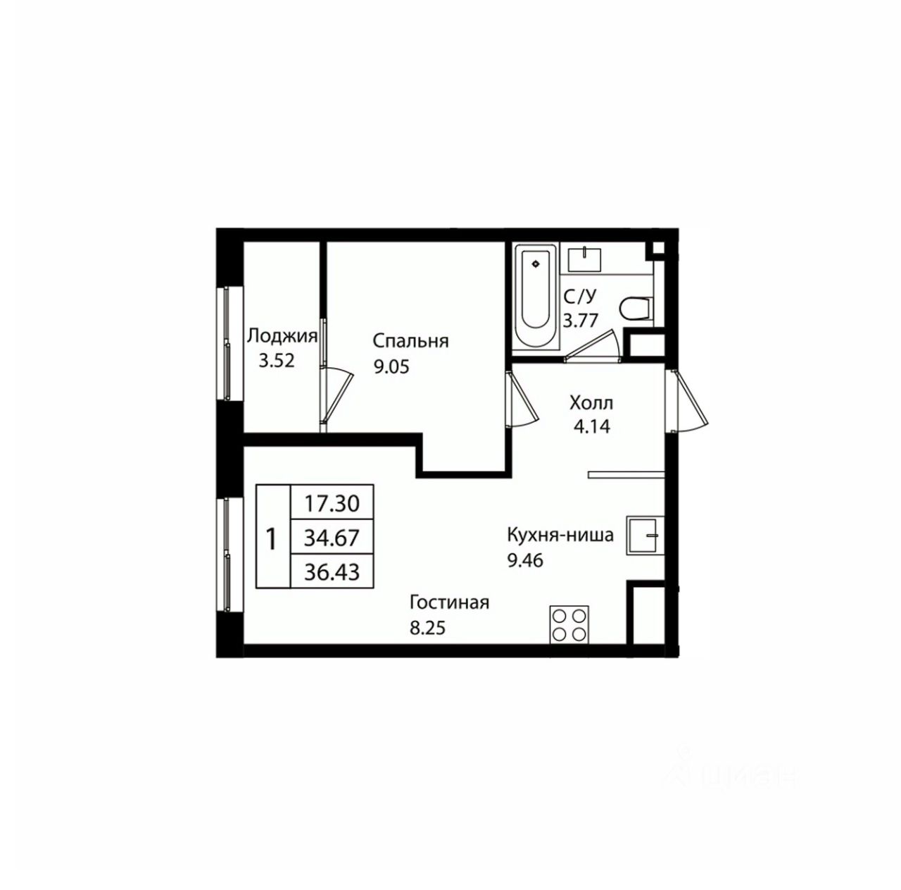Общая площадь36,43 м2