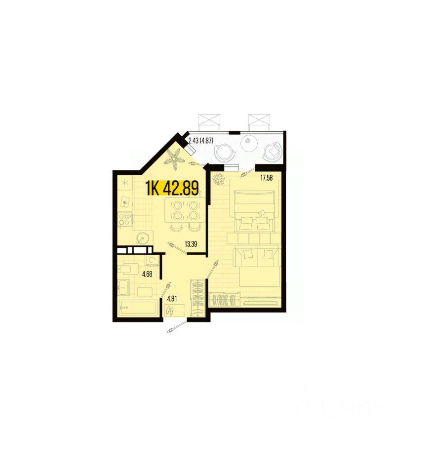 Общая площадь42,89 м2