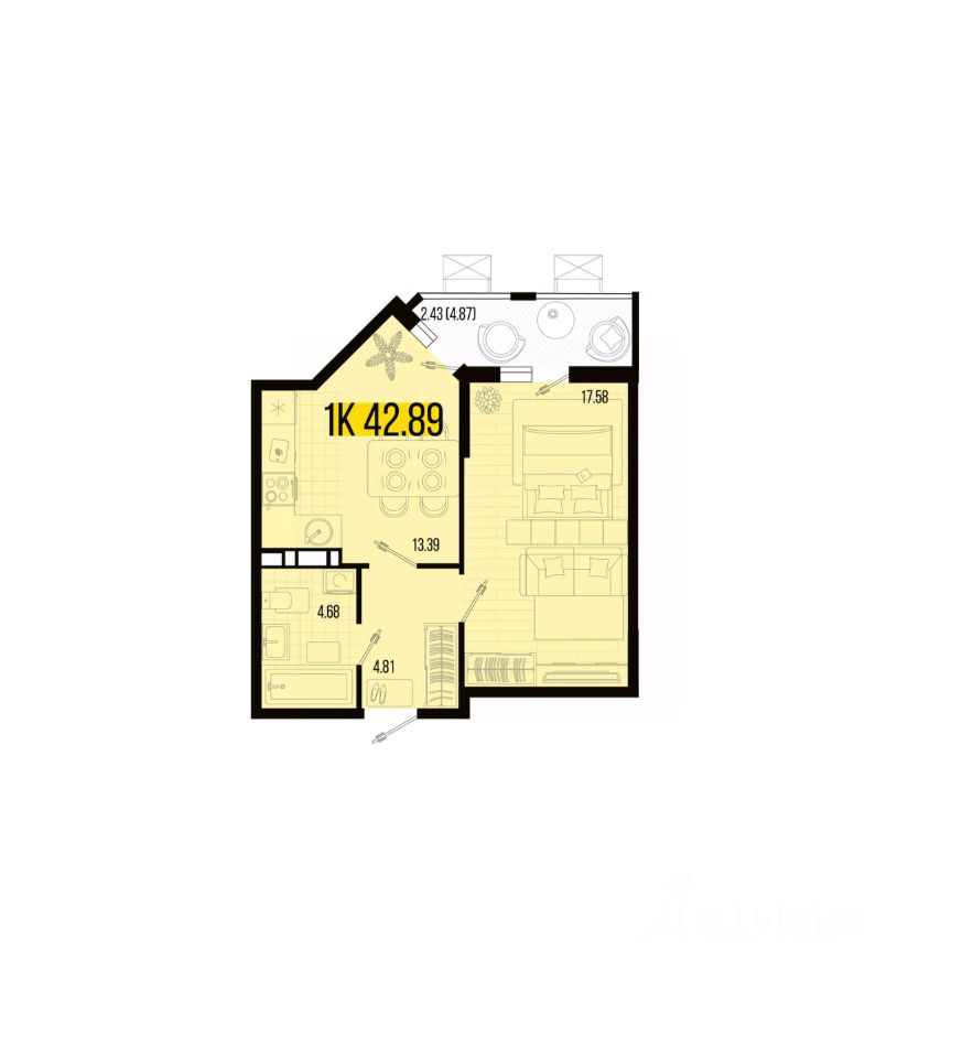 Общая площадь42,89 м2