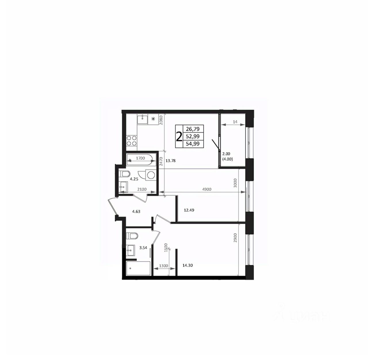 Общая площадь54,99 м2