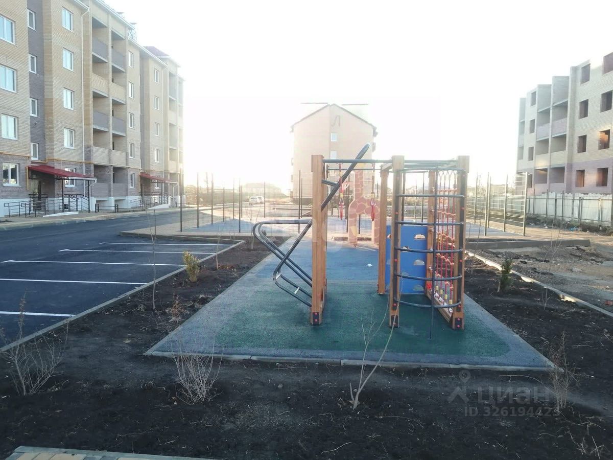 Во дворе большая стоянка для машин и детская площадка.