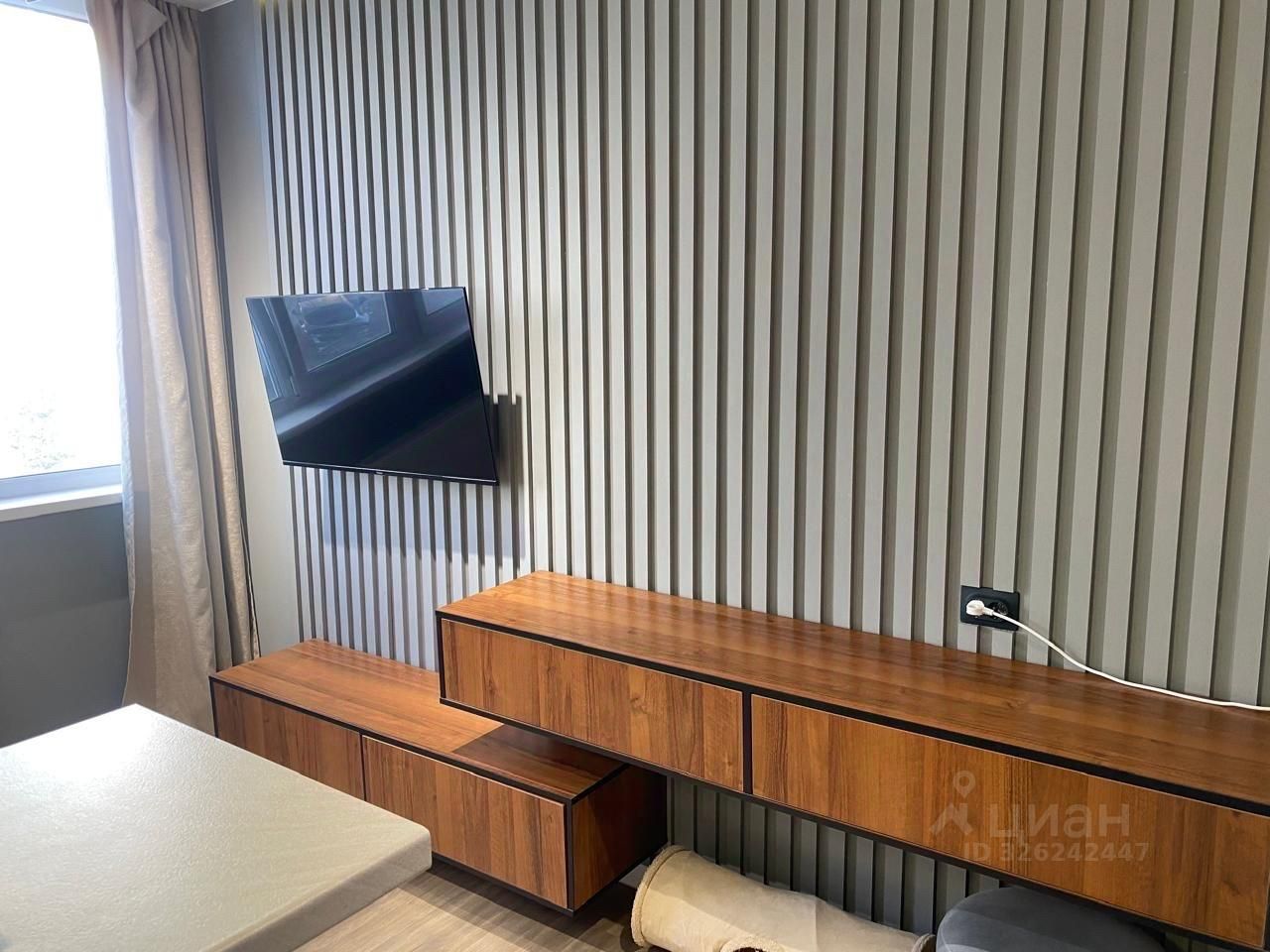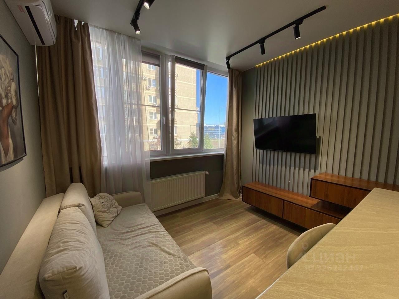 В квартире есть все необходимое для комфортного проживания. Дизайнерская отделка создает уют и современность. В комнате и на кухне установлена мебель, а также вся необходимая техника: кондиционер, холодильник, телевизор и стиральная машина. Ванная комната оборудована душевой кабиной. Благодаря продуманной планировке, можно легко организовать пространство под ваши нужды.