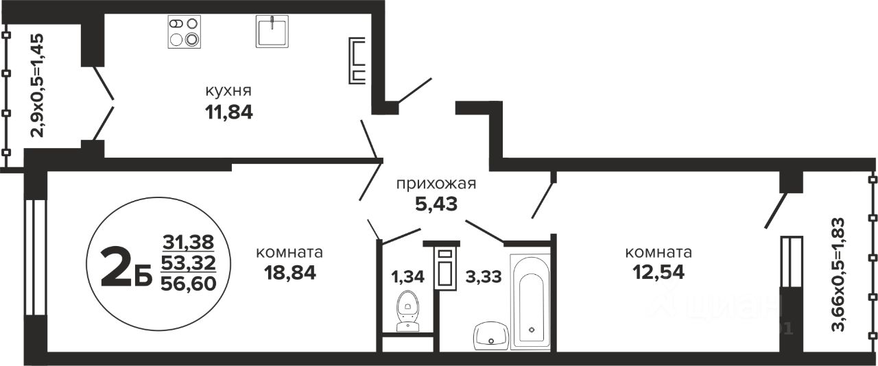 Общая площадь56,6 м2