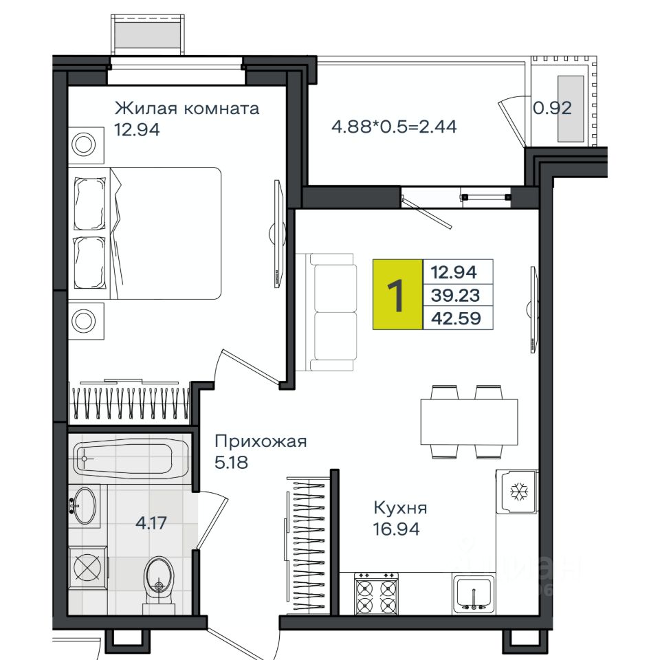 Общая площадь42,59 м2