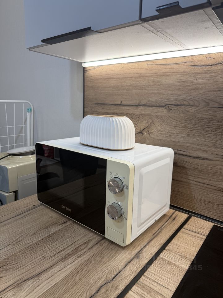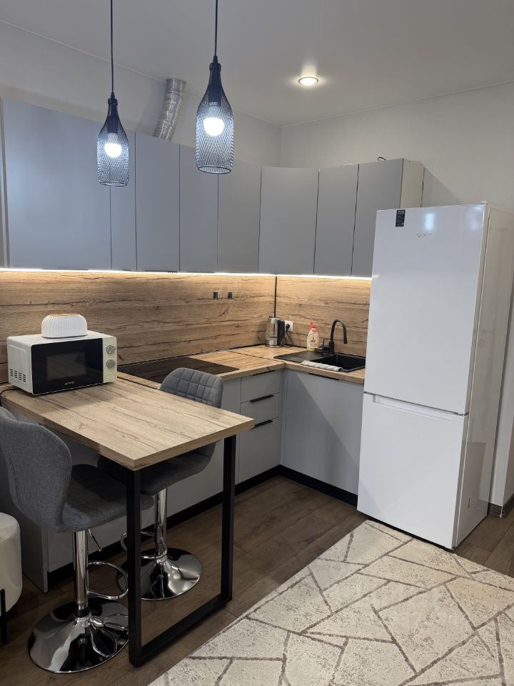 Просторная кухня оснащена необходимой техникой: холодильник, микроволновая печь и плита, посуда.