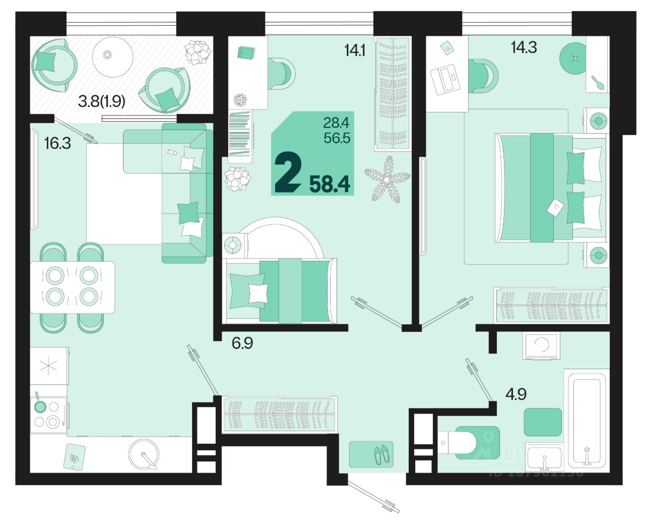 Общая площадь58,4 м2