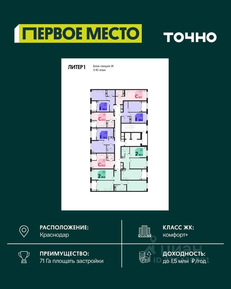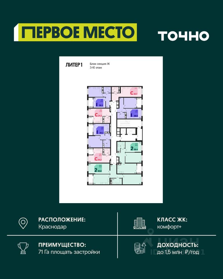 Жилой район ''Первое место''- один из самых масштабных проектов в России. На территории 71 га 18 кварталов, 31 дом переменной этажности от 8 до 18 этажей, собственный парк 9 га, храмовый комплекс, пешеходный бульвар ''Круг семьи'', детские и спортивные площадки, мангальные зоны и различные локации для отдыха. В шаговой доступности действующие муниципальные образовательные учреждения: школа на 1 100 мест и детский сад на 250 мест. Помимо этого, в жилом районе ''Первое место'' построятся школа на 1700 мест с крытым 25-метровым бассейном и 5 детских садов на 1 490 мест. На первых этажах многоуровневых парковок ''паркхабов'' разместится более 61 тыс м2 коммерческих помещений. Жителям будут доступны собственный фитнес-центр, кафе, рестораны и магазины. В каждом подъезде предусмотрены дизайнерские холлы в стиле лобби отелей, консьерж-сервис, лапомойки, отдельные колясочные и велосипедные. Также в домах будут просторные кладовые помещения и комнаты для хранения почты с почтоматами для получения посылок из маркетплейсов.