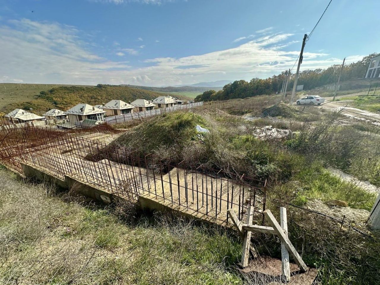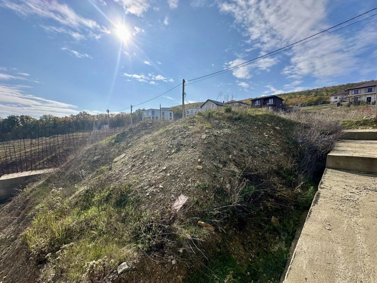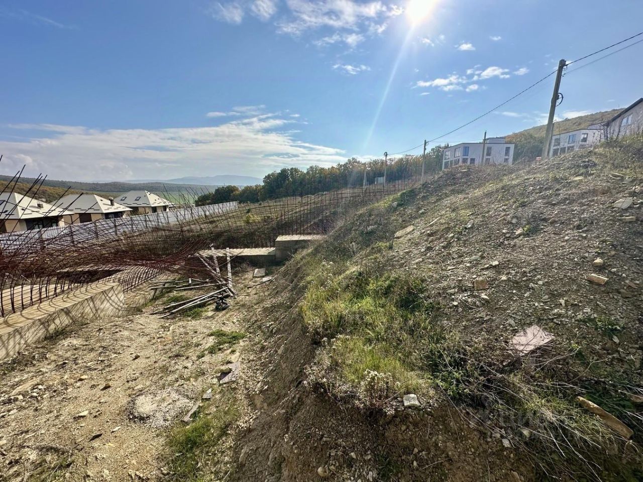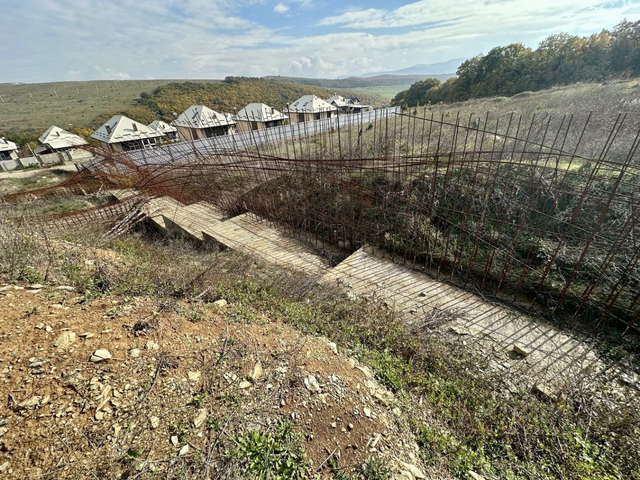 Участок каскадный, по периметру сделаны подпорные стены. На участке есть скважина, заведен свет!