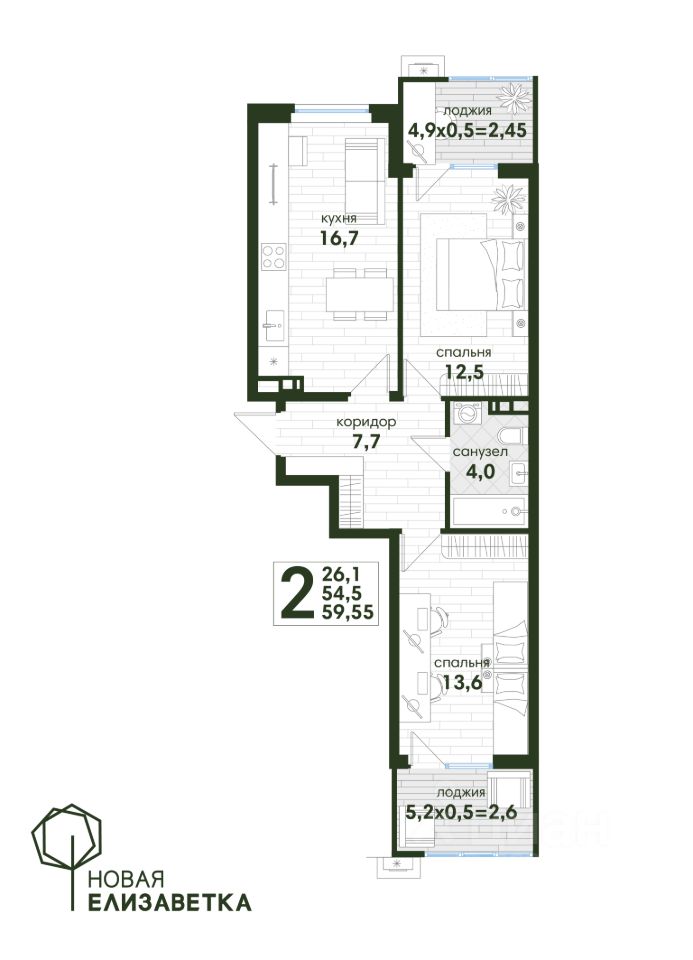 Общая площадь59,55 м2