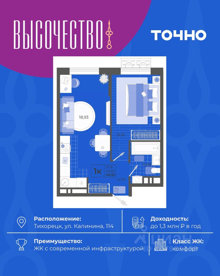 ''Высочество'' — первый ЖК комфорт-класса в Тихорецке. Современные технологии, новейшие представления о комфорте и эргономике жилья -это, то, что характеризует этот комплекс. Расположен в самом центре города. ''Высочество'' — это полностью самостоятельный жилой комплекс, жителей которого порадуют закрытый и свободный от машин двор, коммерческая галерея, спортивные и детские площадки с перголами для отдыха, уютная мангальная зона. По периметру жилого комплекса - открытый бесплатный паркинг на 370 м/мест. Недалеко от ЖК ''Высочество'' находятся детский сад, школы-гимназии, поликлиника, торговый центр, в пешей доступности расположен любимый сквер жителей города ''Звездный''.