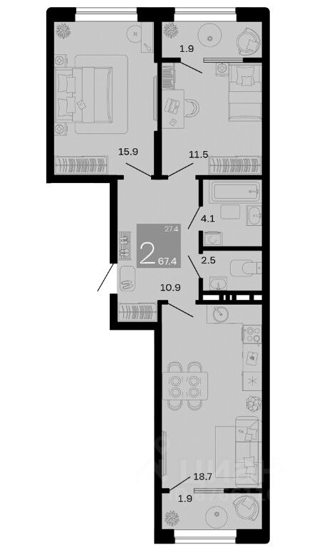 Общая площадь67,4 м2
