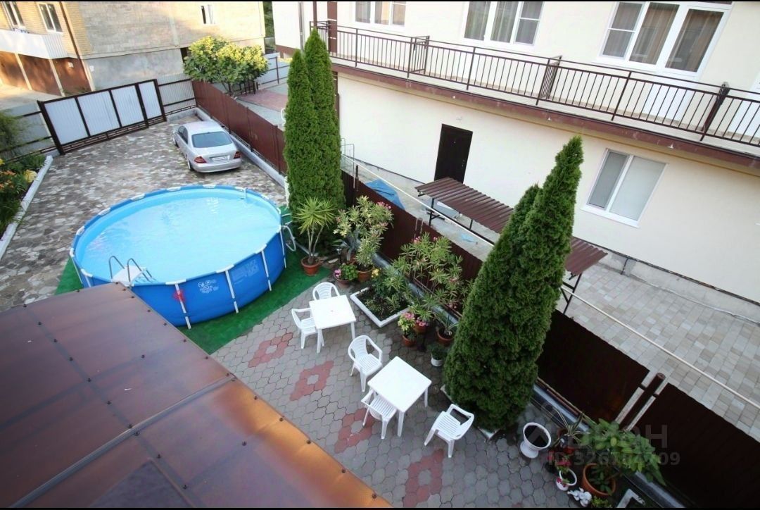 На территории бассейн, зона для загара, детская площадка с батутом, сад с плодовыми деревьями и цветами.