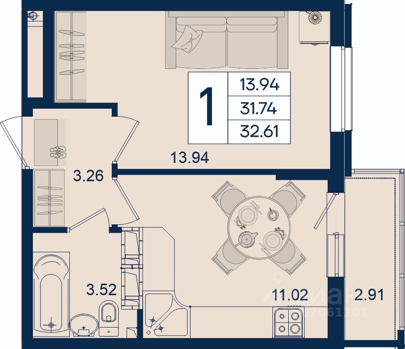 1 комнатная квартира с ремонтом 32.61 м², на 9 этаже в жилом комплексе ''Дом 101''.