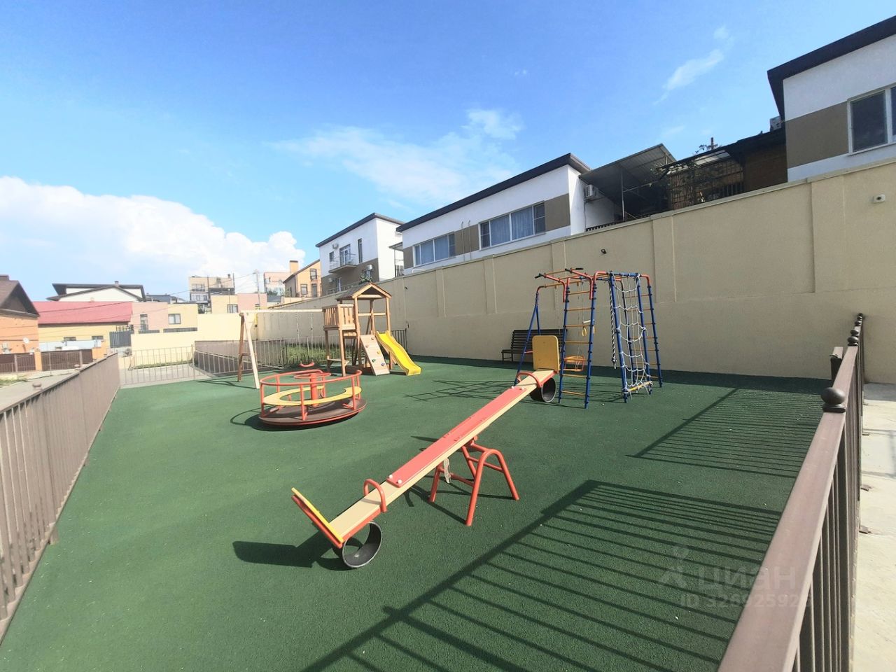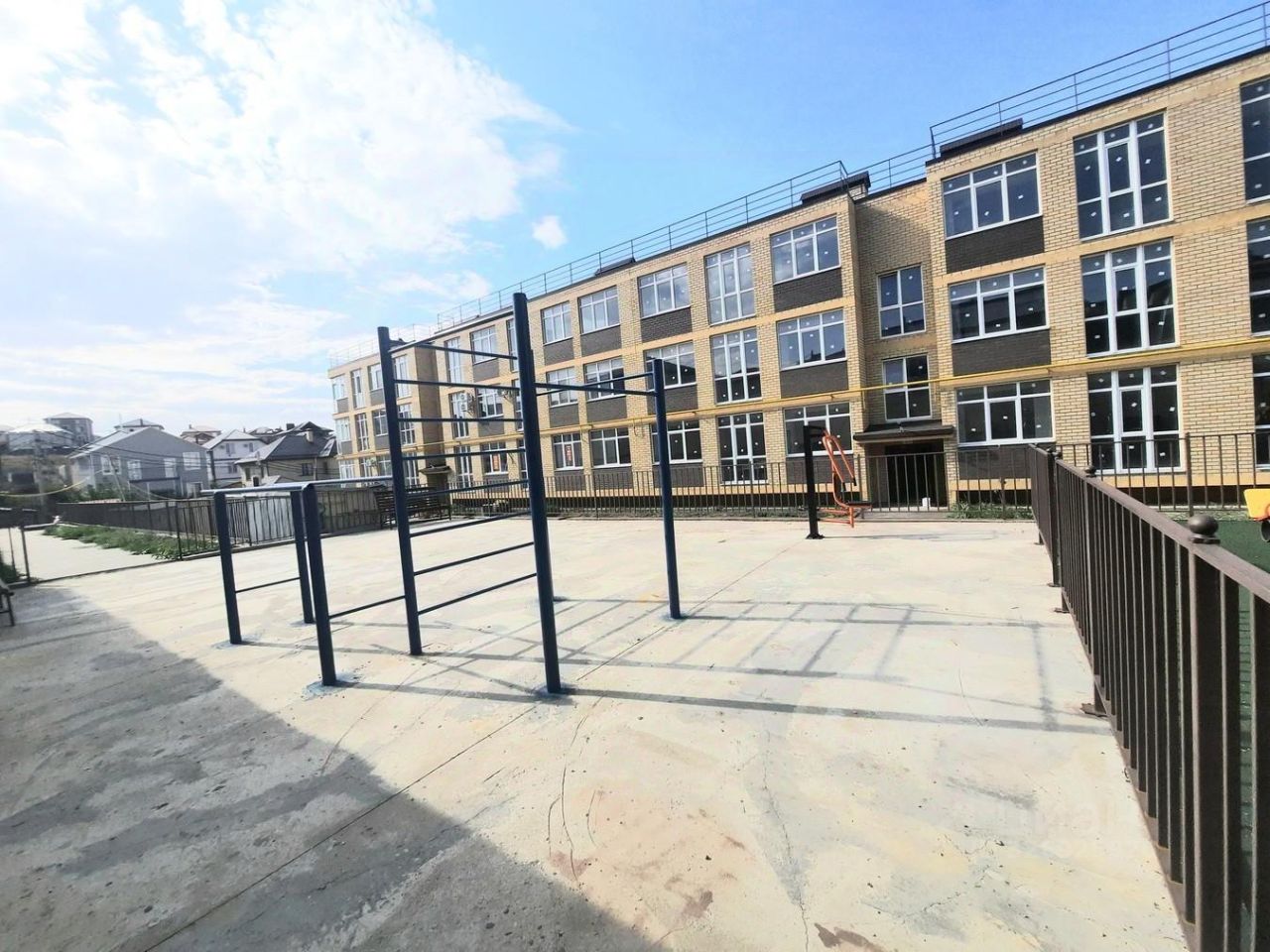 На территории детская и спортивная площадки.
