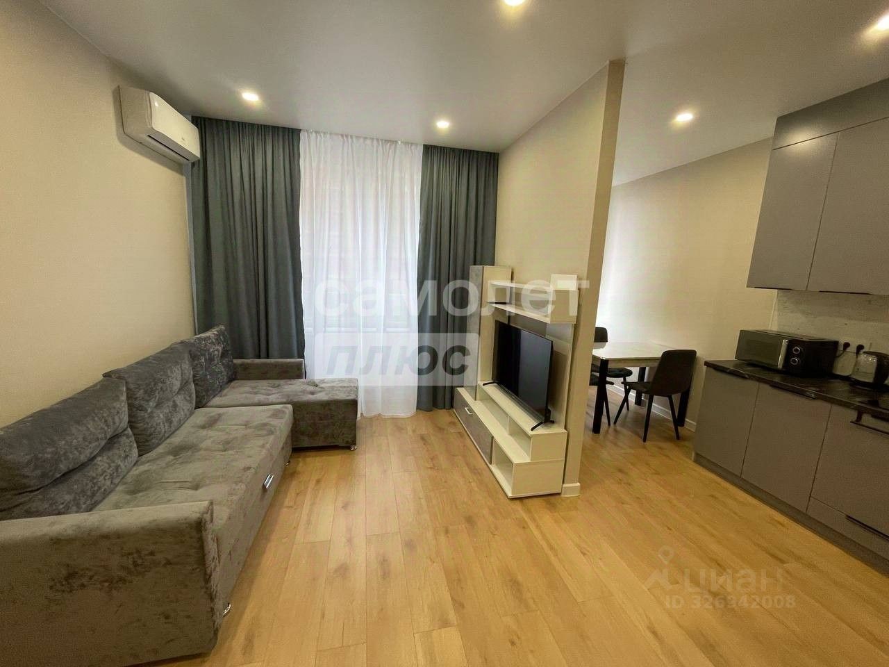В первой комнате установлен 2 спальный раскладной диван бежевого цвета с местом для хранения одежды, полка под телевизор, телевизор, установлена сплит система.