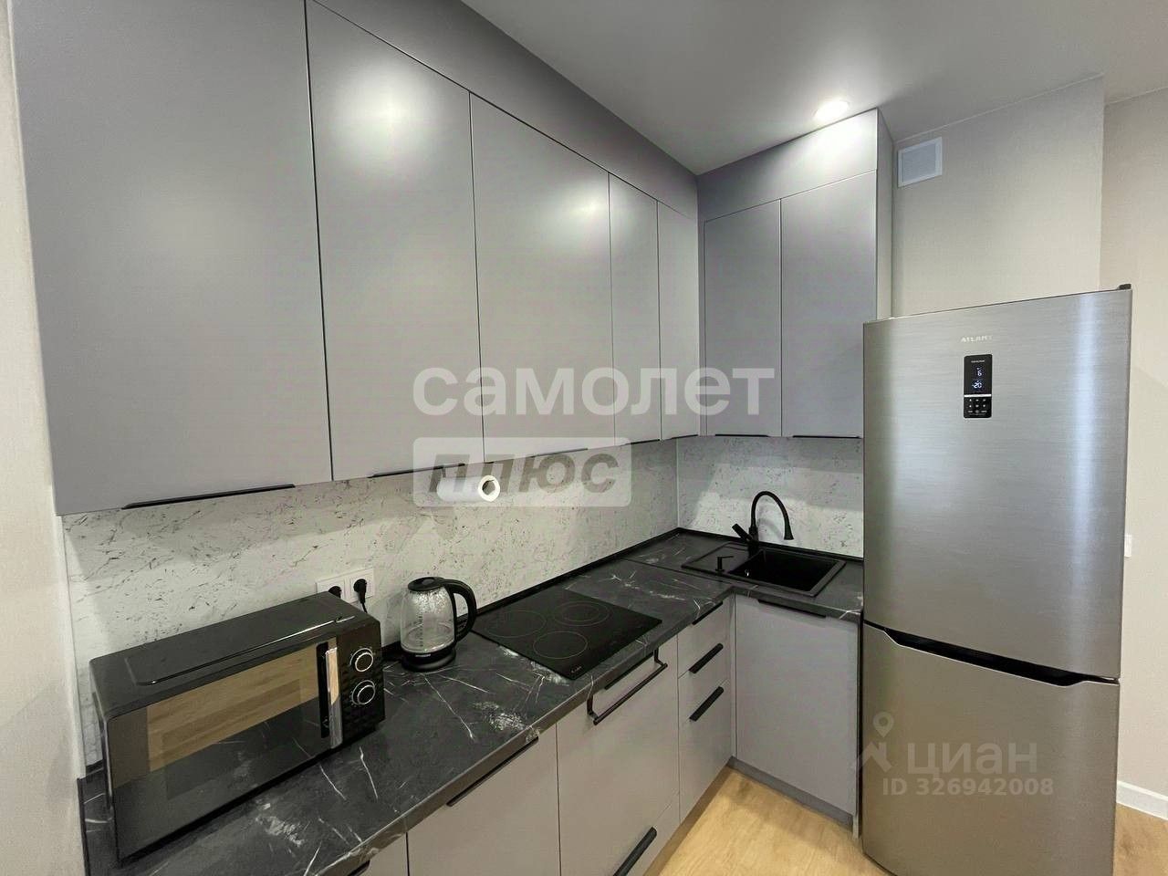 В квартире выполнен качественный дорогой ремонт: в кухне гостиной установлены: кухонный гарнитур, электрическая плита с 3 конфорками, микроволновая печь, кухонный стол с 3 стульями, электрический чайник, холодильник. Панорамное остекление. В гарнитуре имеются столовые принадлежности, посуда.
