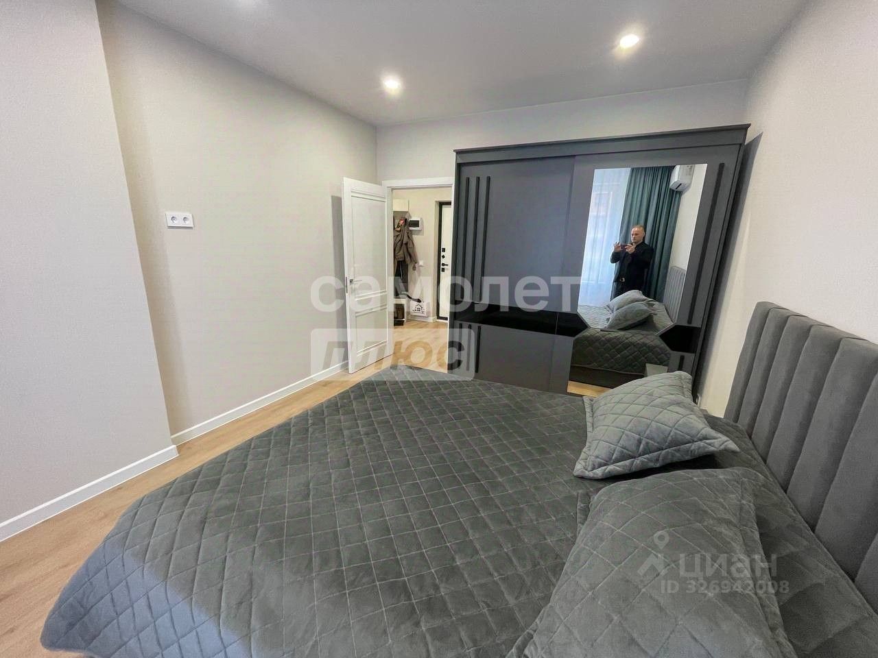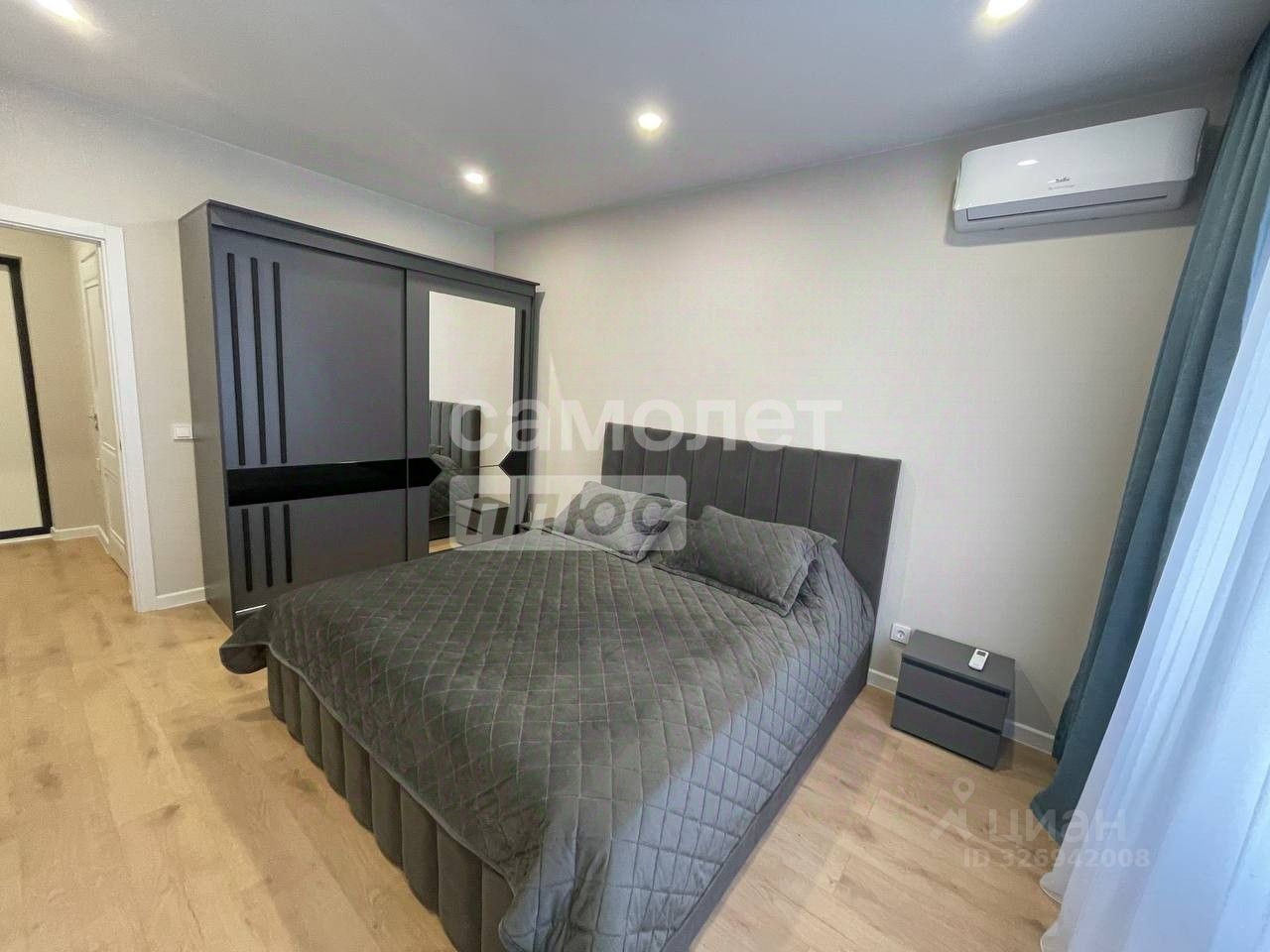 Во второй комнате установлена 2 спальная кровать с матрасом, шкаф купе для одежды с зеркалом, прикроватная тумба. Установлена сплит система. В просторной прихожей установлена обувница. Рядом с прихожей имеется просторная кладовка.