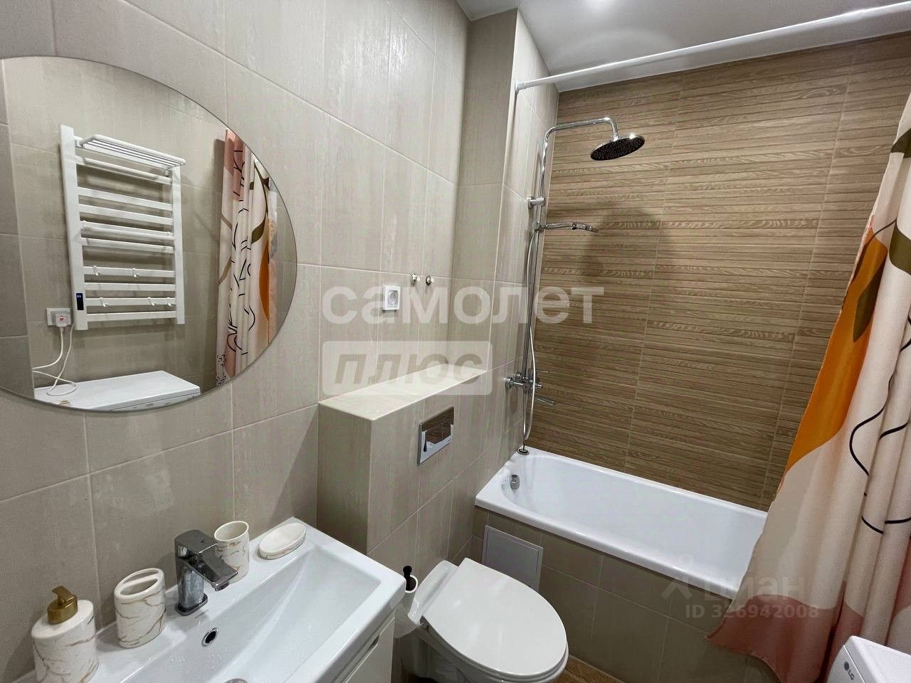 Ванная комната в качественном кафеле: установлена просторная ванна, новая стиральная машинка, зеркало, электро-сушилка, смеситель с функцией тропический дождь.