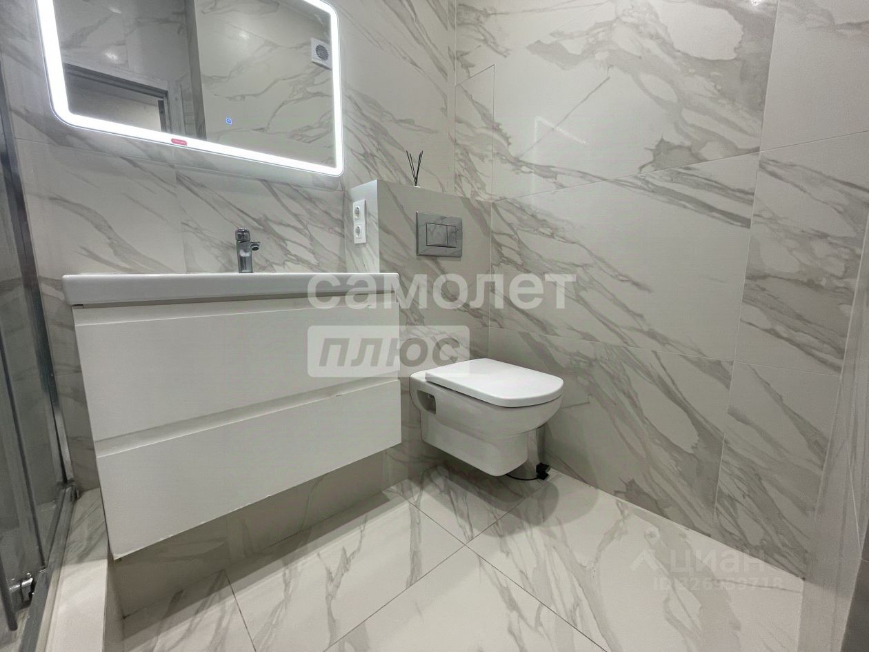 • Ванная комната в стиле Lux: Керамогранит под мрамор, парящее зеркало с подсветкой, современная душевая кабина и качественная сантехника.