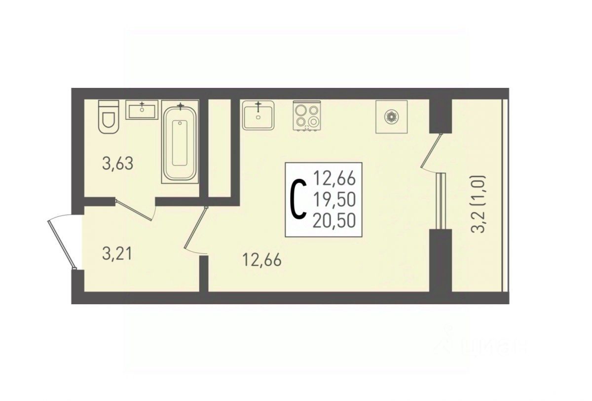 Видовая студия площадью 20,4 м² с большой лоджией 3,2 м² и панорамным остеклением.