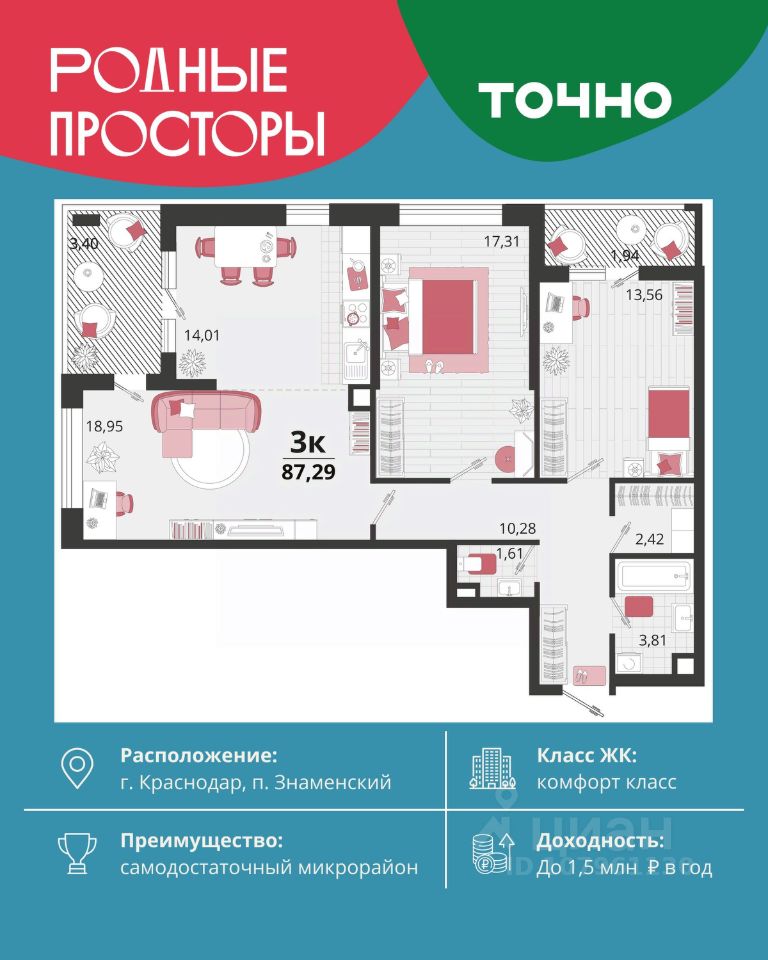 ''Родные просторы''- самодостаточный микрорайон, который реализован по принципу комплексного развития территории, где есть вся инфраструктура для комфортной жизни. На территории 41 га 29 домов от 9 до 24 этажей, уютные дворы со спортивными и игровыми площадками, социальные и коммерческие объекты, зеленые массивы и фонтаны. Главная точка притяжения ''Родных просторов'' - парк семейного отдыха площадью 9 га, 4,5 км прогулочных аллей, амфитеатр для мероприятий, кинофестивальная площадка. Особая гордость микрорайона современная школа на 1550 мест и 3 детских сада ''Ладушки'', ''Веснушки'' и ''Топотушки'' на 880 малышей. В центре микрорайона строятся фитнес-клуб BALANCE с акватермальным комплексом и собственная поликлиника, площадью более 5000 кв.м.